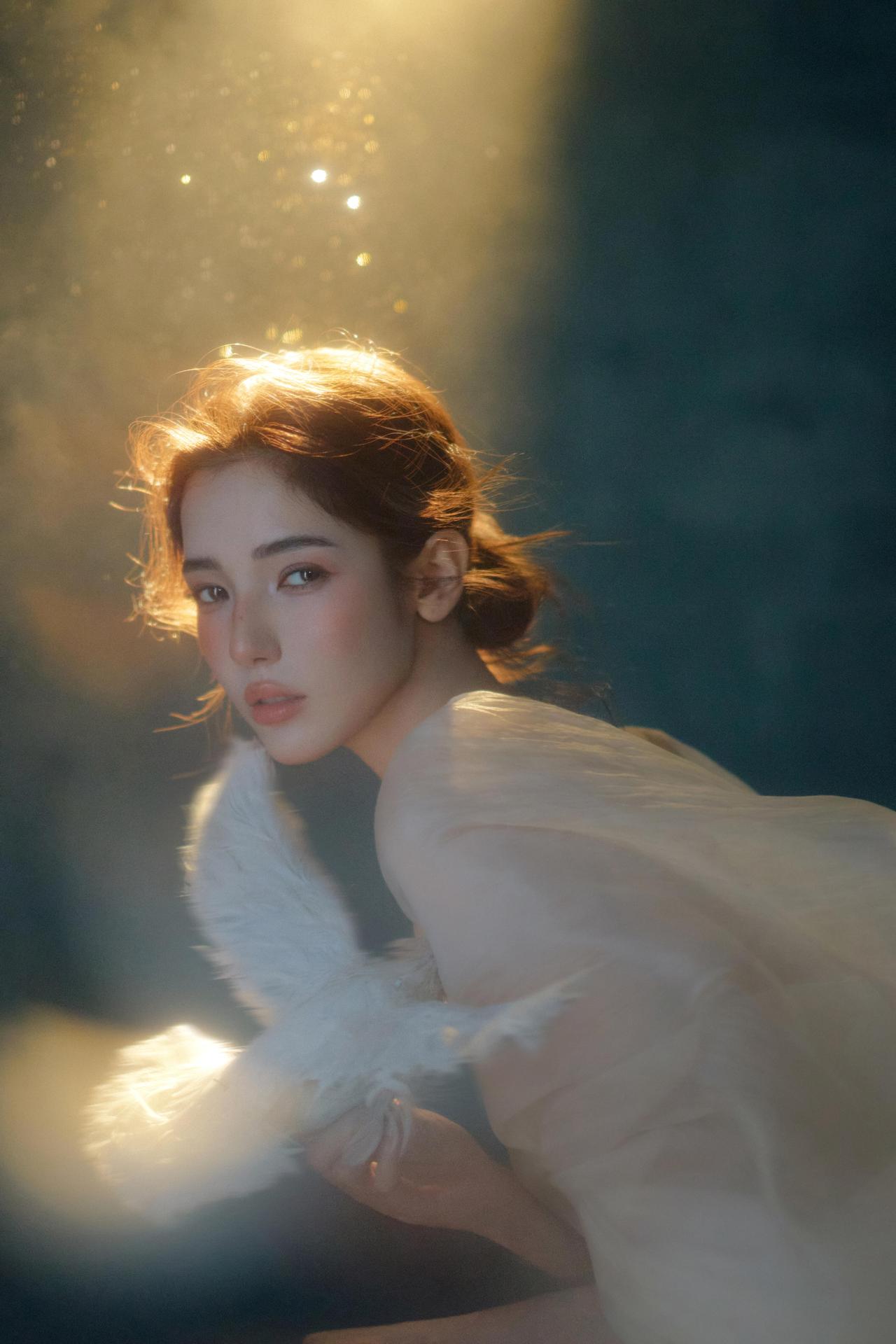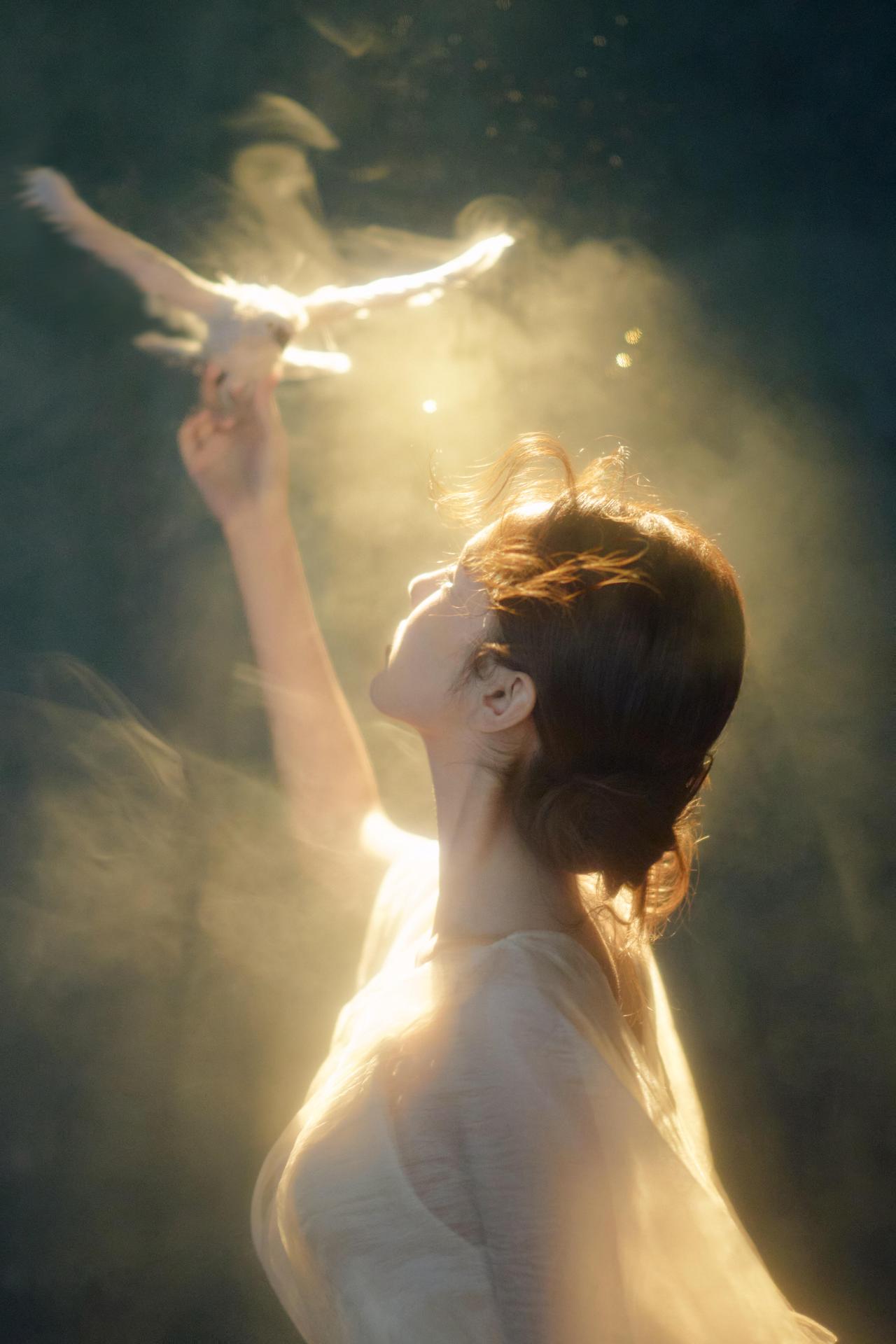 这张作品以侧逆光塑造出“天使降临”的氛围感,人物的转身姿态与手中的白鸽形成叙事性互动。暖调光线从右侧切入,在人物的背部与白纱上形成柔和的轮廓光,纱质的半透质感在光线的穿透下呈现出丰富的层次变化。人物低垂的眼眸与专注的神情,传递出一种温柔又悲悯的情绪,白鸽的羽毛在光线下呈现出细腻的纹理,成为画面的视觉焦点。烟雾的运用让光线呈现出流动的质感,暗部的细节保留完整,使画面具备了良好的空间纵深感。不足在于人物手部的光线稍显薄弱,若增加局部补光,可让手部的动作细节更清晰。