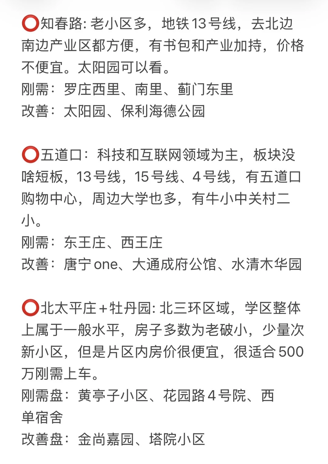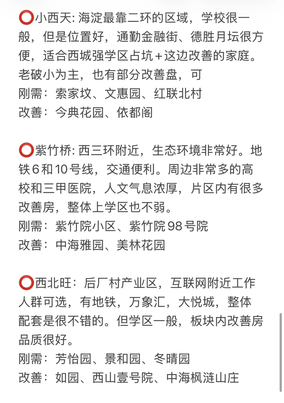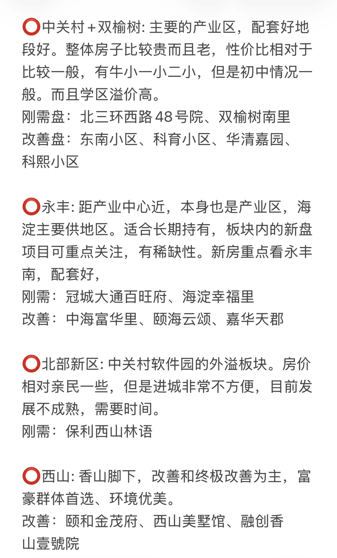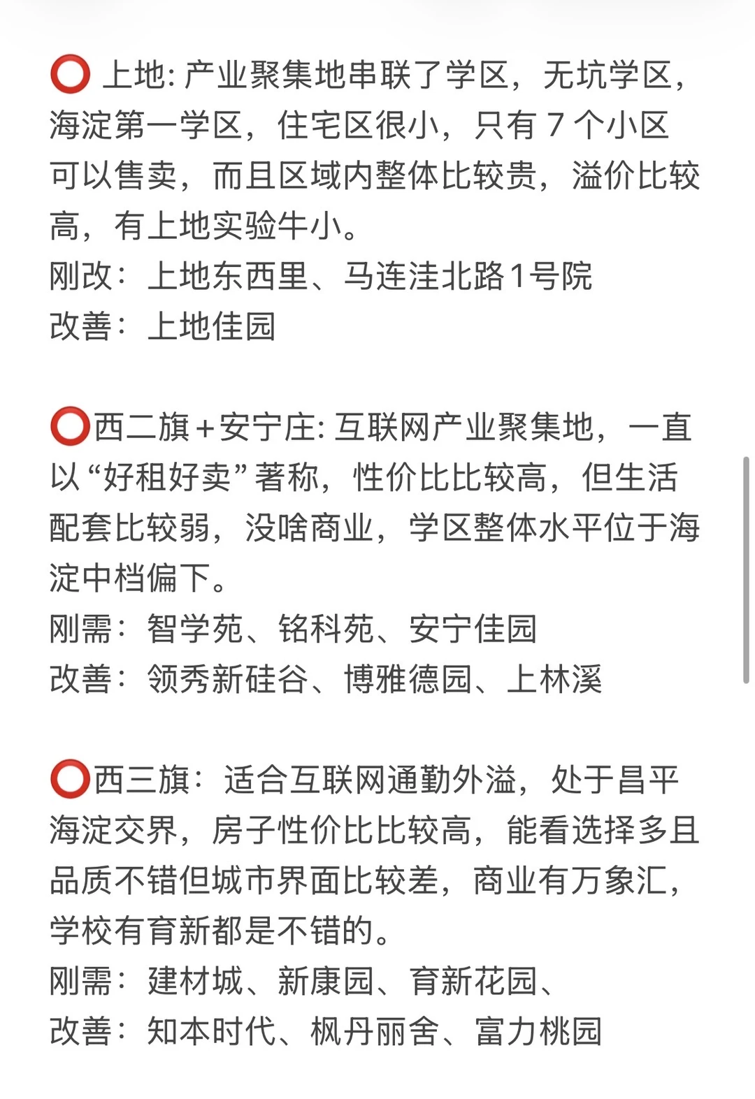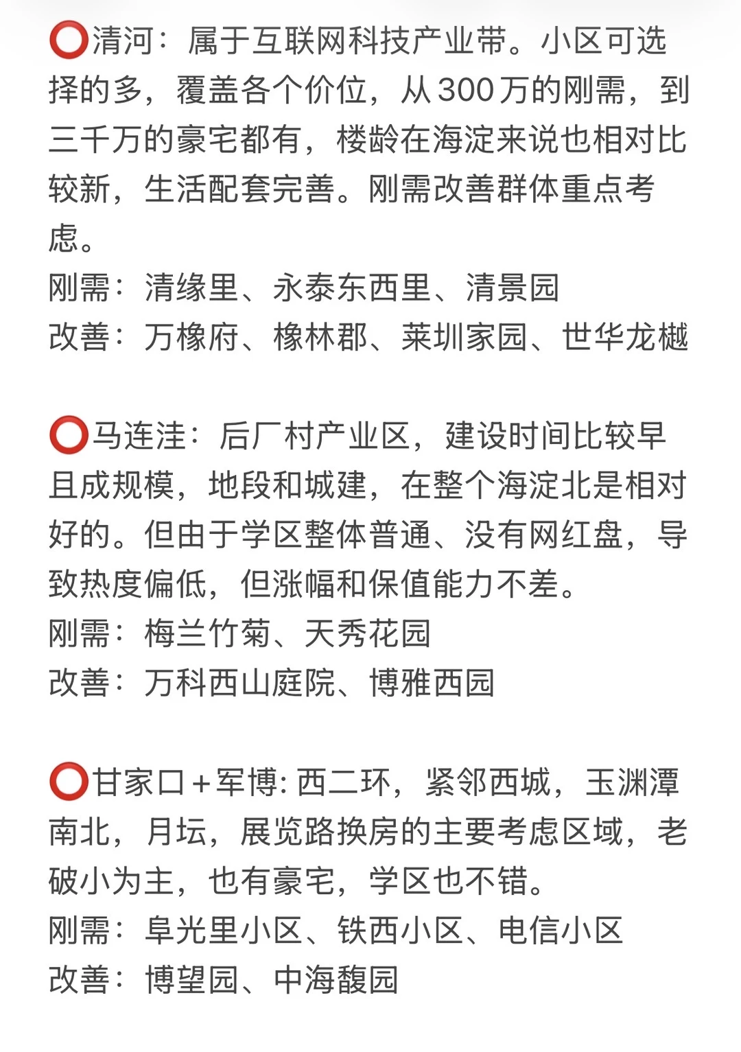 ⭕️清河:属于互联网科技产业带。小区可选择的多,覆盖各个价位,从300万的刚需,到三千万的豪宅都有,楼龄在海淀来说也相对比较新,生活配套完善。刚需改善群体重点考虑。