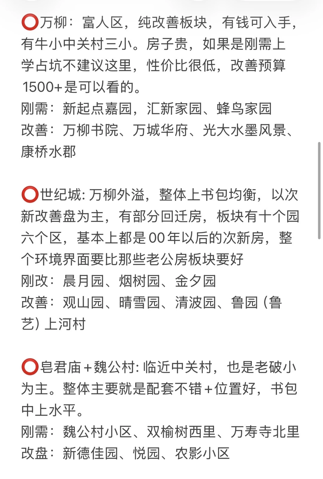 ⭕️四季青: 小区的密度普遍不高,房龄相对海淀其他区来说,算是比较新的,能兼顾各个价位,改善房占比高,纯商品房可选择的多,整体学校一般。10号线+6号线慈寿寺、五路居站