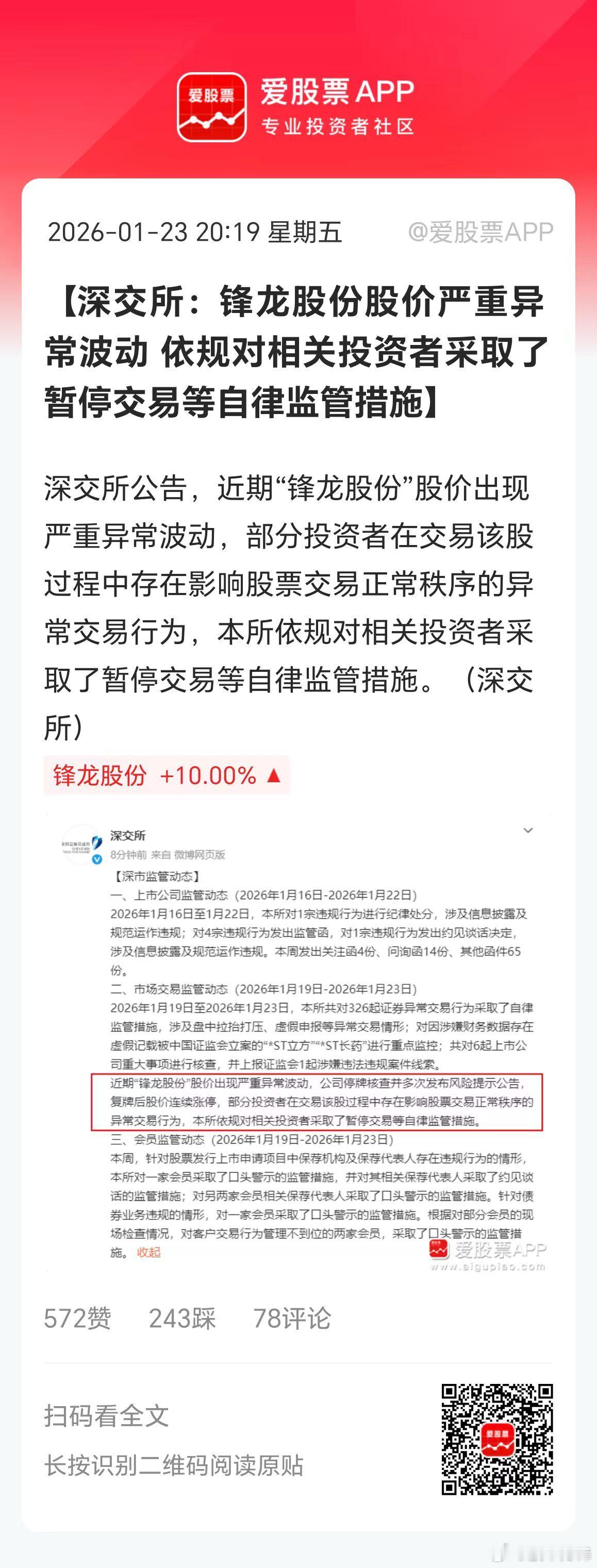 今晚村里又出手了,锋龙股份是目前市场上最妖的票,之前被关小黑屋,但不惧监管飙出18连阳!现在直接暂停部分投资者交易,让他们不许买卖了,这属于是釜底抽薪!杀伤力比特停更大。不过今天锋龙股份历史天量换手,高达19.2%,成交38.46亿!下周本来就要断板了,今天这个拔网线。可能造成一个情况,就是之前赚的盆满钵满的大户获利跑了,今天进场接力的大户+散户可就惨了。之前暂停过部分投资者交易的大牛股,有*ST铖昌,上纬新材,天普股份。其实股价都很坚挺的,A股牛市头铁资金太多,是很难完全砸下来的!(爱股君)