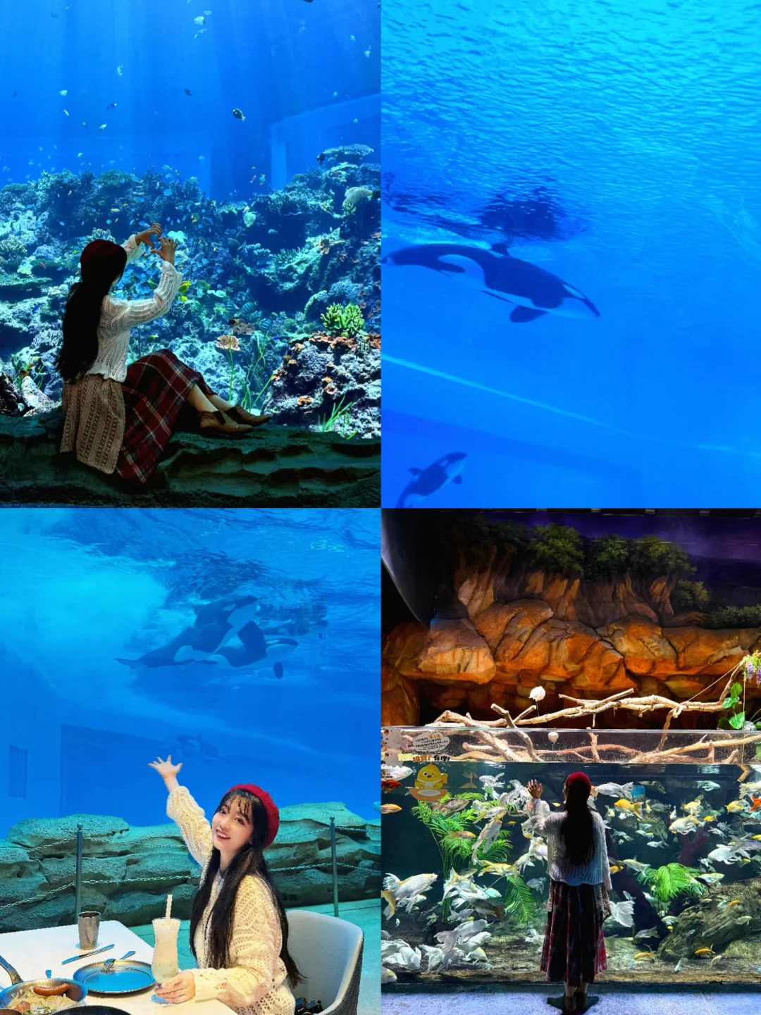 ✅ 鲸生鲸世餐厅:虎鲸在身旁游过,搭配精致的餐点,暖光与海底光影交织,随手一拍就是自带电影滤镜的质感大片,漂亮饭的高级感此刻直达顶峰~