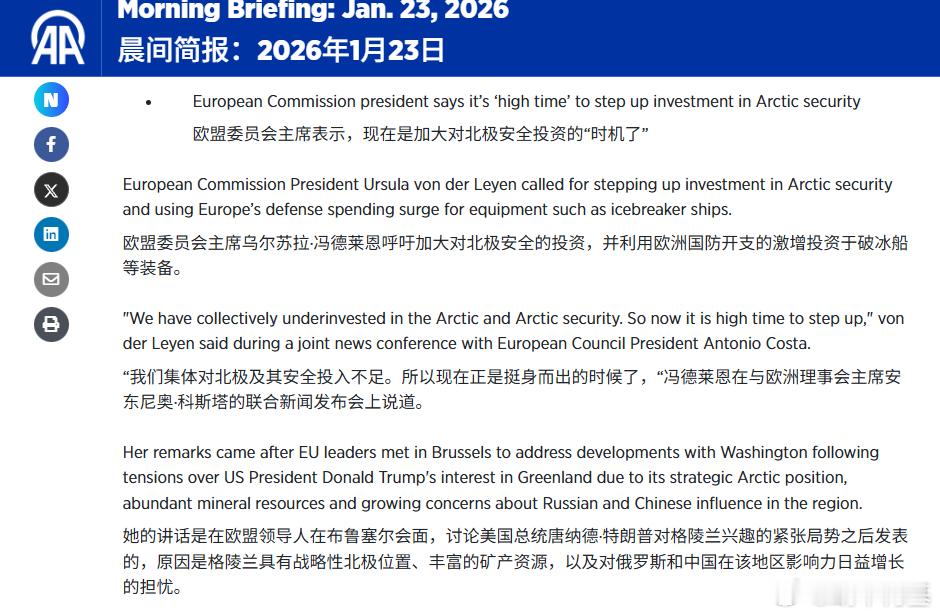 冯德莱恩呼吁加大对北极安全的投资,并利用欧洲国防开支的激增投资于破冰船等装备。来源:AA特朗普因格陵兰岛向欧洲8国加税特朗普称将占领管理委内瑞拉特朗普回应是否抓捕普京