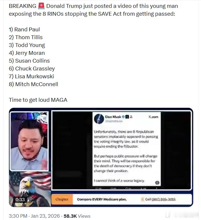 8位“共和党内叛徒”(RINO)阻挠《SAVE法案》通过:兰德·保罗(Rand Paul)汤姆·蒂利斯(Thom Tillis)托德·杨(Todd Young)杰里·莫兰(Jerry Moran)苏珊·柯林斯(Susan Collins)查克·格拉斯利(Chuck Grassley)丽莎·默克尔斯基(Lisa Murkowski)米奇·麦康奈尔(Mitch McConnell)