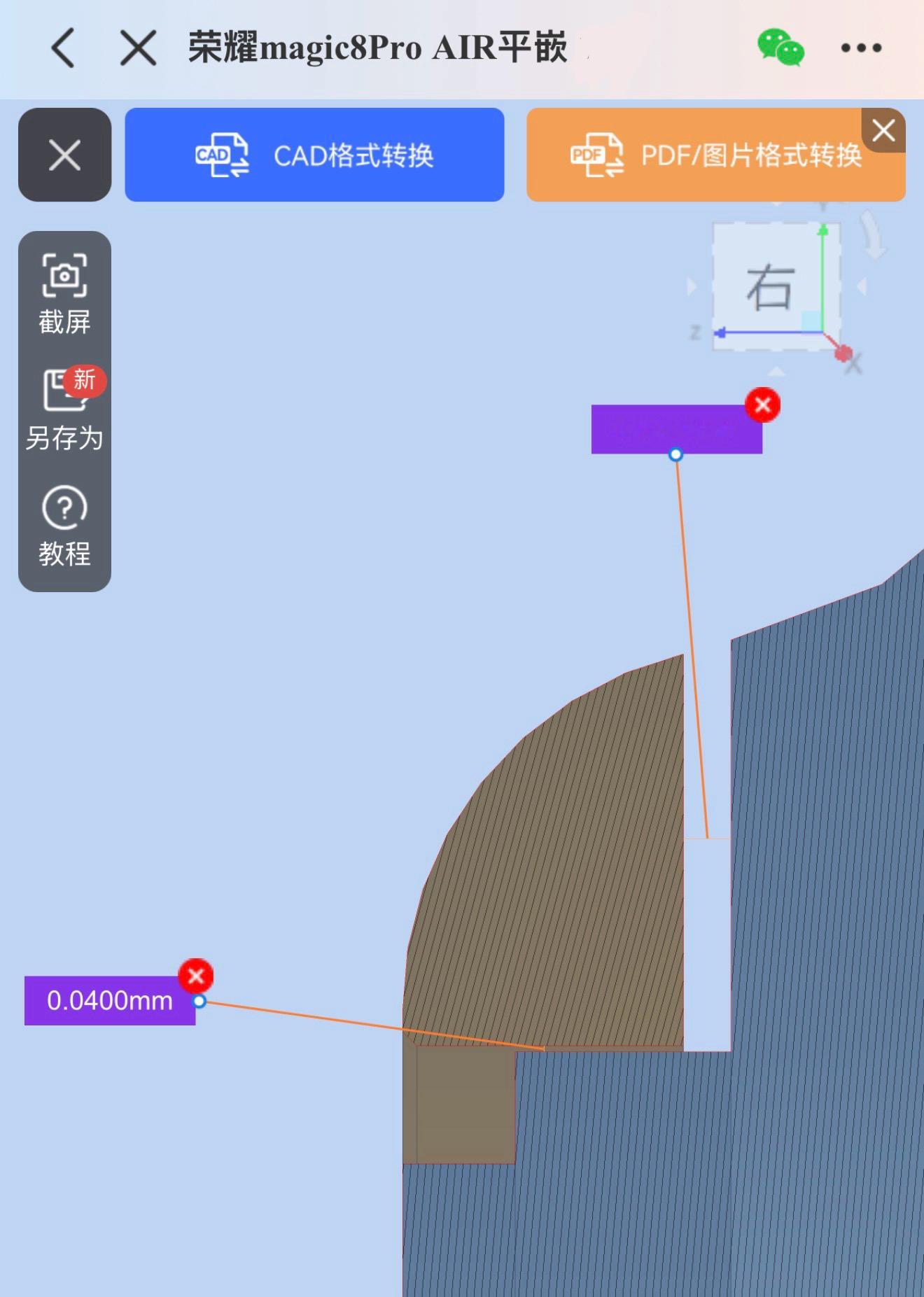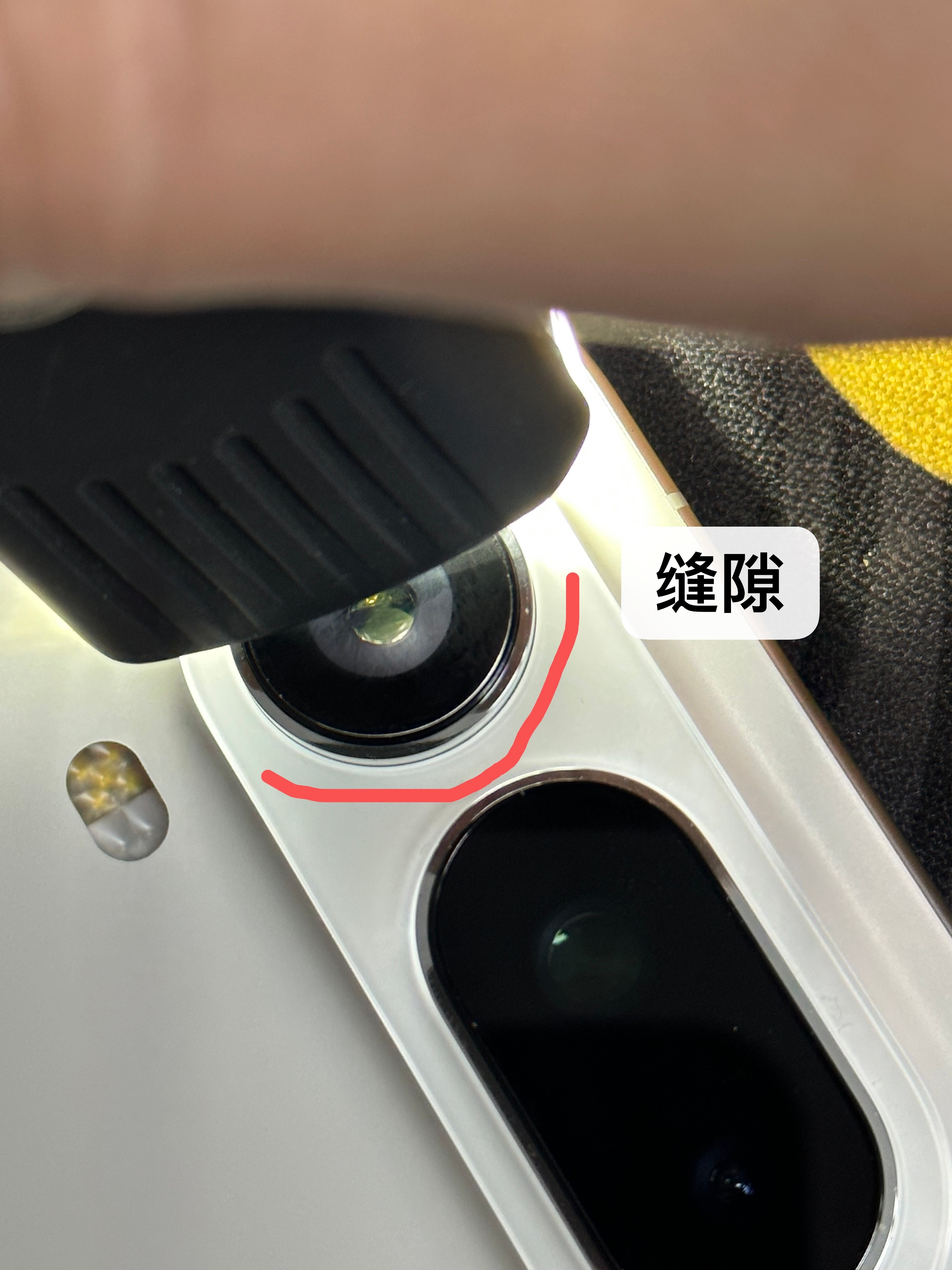 不慌,荣耀 Magic8 Pro Air 平嵌镜盖继续生产。经过同事的放大镜查看,找到了手机的微缝泄压,就是镜头金属件与镜头平面之间,一条小于0.1mm 的缝隙。那我们平嵌镜盖可以确定不会有影响,因为镜盖的摄像头开孔直径比真机大0.08mm,而且镜盖于镜头平面还有0.34mm 间隙,这个地方用图二白色区域的双面胶来贴上,双面胶单边留了0.7mm 余量,完全不会影响泄压阀的工作。经过我们贴上镜盖后的真机测试,没有影响。