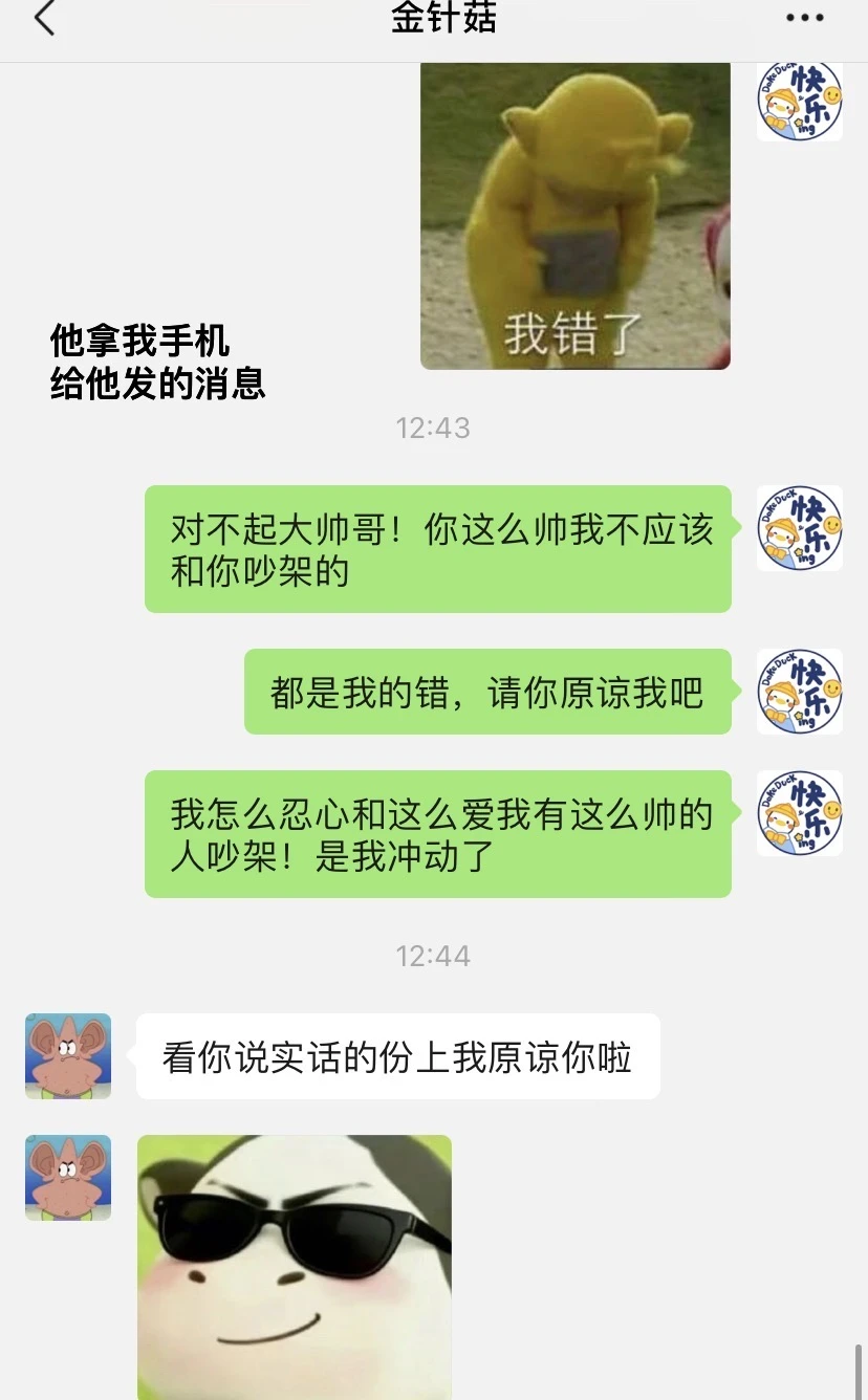 和对象有点误会吵架了,是我冤枉他了,刚准备哄他我发现他拿我手机给他发对不起[捂脸R]自己夸了自己一顿自己把自己哄好了[捂脸R]