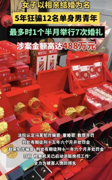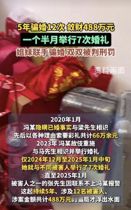 快过年了,单身的男人们要多注意了,过年回家相亲找老婆一定要擦亮眼睛。1月22日,河南周口两姐妹以相亲结婚为名,5年的时间竟然合伙骗了12名农村单身男青年,一共骗到了488万元,平均每人被骗40.6万元。(文中人物均为化名) 事情要从2020 年说起,当时河南周口西华县的马某和姐姐赵某为了赚钱,把目光投向了当地农村的单身男青年群体。她们看准了这些青年因婚恋焦虑而容易放下防备的心理,决定以相亲结婚为幌子,策划一场长期骗局。 马某性格外向,擅长扮演温顺可靠的结婚对象,能在短时间内获取对方的信任;姐姐赵某则沉稳内敛,全程以 “未来大姨姐” 的身份出现,不仅帮着佐证妹妹单身的假象,还负责接收和保管诈骗所得,甚至会根据骗局的进展编造各种圆场的谎言。 两人的作案模式固定且分工明确。马某先通过当地媒人介绍与农村单身男青年结识,确立恋爱关系后,就开始以彩礼、购买三金、筹备酒席、给家人见面礼等各种理由索要钱财。 赵某则在一旁不断给受害者 “洗脑”,用家人的身份强调妹妹的诚意,让受害者放松警惕。2020 年 1 月,马某在隐瞒自己已婚事实的情况下与梁先生相识,短短几个月内就以各种名义索要了 66 万余元的彩礼。 2023 年,她又故技重施,与马先生相识并举行婚礼,继续骗取对方的财物。更令人震惊的是,仅在 2024 年 12 月到 2025 年 1 月中旬这一个多月里,马某就与不同的受害人先后举行了 7 次婚礼,频率高得离谱。 这些受害者大多是老实本分的农村青年,他们拿出的不仅是自己打工多年的积蓄,还有不少是向亲戚朋友东拼西凑借来的钱,原本以为能换来一个安稳的家庭,没想到却陷入了精心设计的骗局。 直到 2025 年 1 月,一名张先生因为迟迟联系不上马某,才意识到事情不对并选择报警,这场持续了 5 年、涉及 12 名受害者的骗局才彻底浮出水面。 警方介入调查后发现,12 名农村单身男青年累计被骗金额高达 488 万元,平均每人被骗超过 40.6 万元,这笔钱对普通农村家庭来说,几乎是一辈子的心血。 2025 年 1 月 27 日,侦查机关将该案移送西华县检察院审查起诉。 1 月 29 日,法院全部采纳了检察机关指控的犯罪事实和量刑建议,以诈骗罪、重婚罪数罪并罚,判处马某有期徒刑十五年六个月并处罚金,判处赵某有期徒刑十一年六个月并处罚金。两人用五年时间编织的骗局,最终以锒铛入狱收场。 事件曝光后,网友们在评论区炸开了锅。 有人留言说:“农村找对象本来就难,这下半辈子的积蓄都被骗光了,以后可怎么生活。” 也有人感慨:“相亲的时候一定要多留个心眼,尤其是涉及大额钱财,必须核实清楚对方的身份和婚姻状况。” 还有人提醒身边的亲友:“这种团伙作案太隐蔽了,家里有单身青年的都要警惕起来,别被花言巧语骗了。” 这件事给所有人都敲响了警钟:在婚恋关系中,面对大额财物往来一定要保持理性,不要被对方的表面说辞迷惑。要通过正规渠道核实对方的身份、婚姻状况等关键信息,比如到当地派出所查询,或者向对方的亲友、邻居侧面了解情况。 涉及彩礼等大额支出时,最好通过银行转账并保留凭证,一旦发现异常,要及时报警,避免造成更大的损失。同时,农村地区的婚恋中介也需要加强规范,从源头上减少此类骗局的发生。 你身边有没有遇到过类似的相亲骗局?欢迎在评论区分享你的经历和看法,让更多人提高警惕。