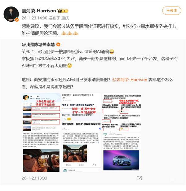 大批量AI通稿碰瓷深蓝S07!CEO姜海荣回应:将坚决打击