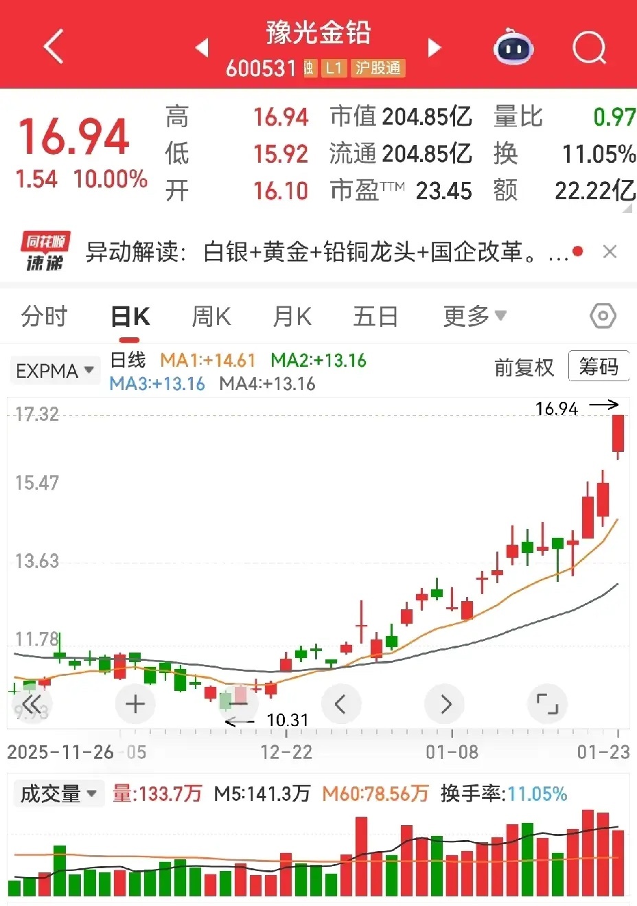 上天讲过双针扎底形态,时隔两天,再来回顾。豫光金铅,前两天还在蓄势,量能略有放出,今天燃了,涨停。金瑞矿业,前天涨停,昨天小幅洗盘,今天中阳涨了4.86%,持续性不错。盛屯矿业,仍然在整理状态中,何时会有表现,或者说会不会有表现,还得再观察。总体走势还是看生命线的趋势,如果用保守眼光看,离生命线远的要注意风险,近的要好一些。
