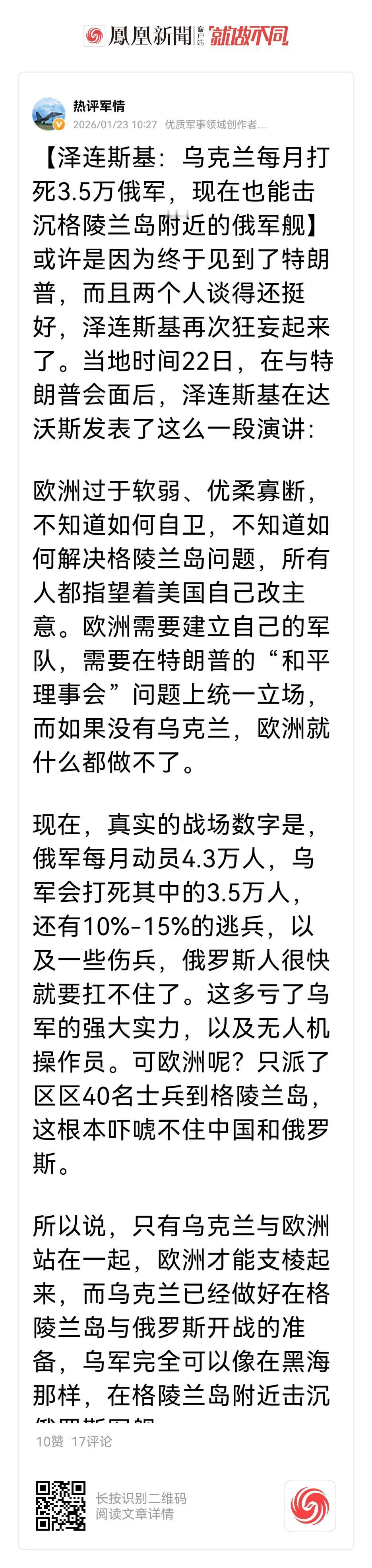 泽圣达沃斯论坛演讲说:欧洲只派了区区40名士兵到格陵兰岛,这根本吓唬不住中国和俄罗斯。一一这不是装傻、演戏,而是向美献媚、且心坏!东大还任其胡言乱语,没有任何反击,也是很无语。