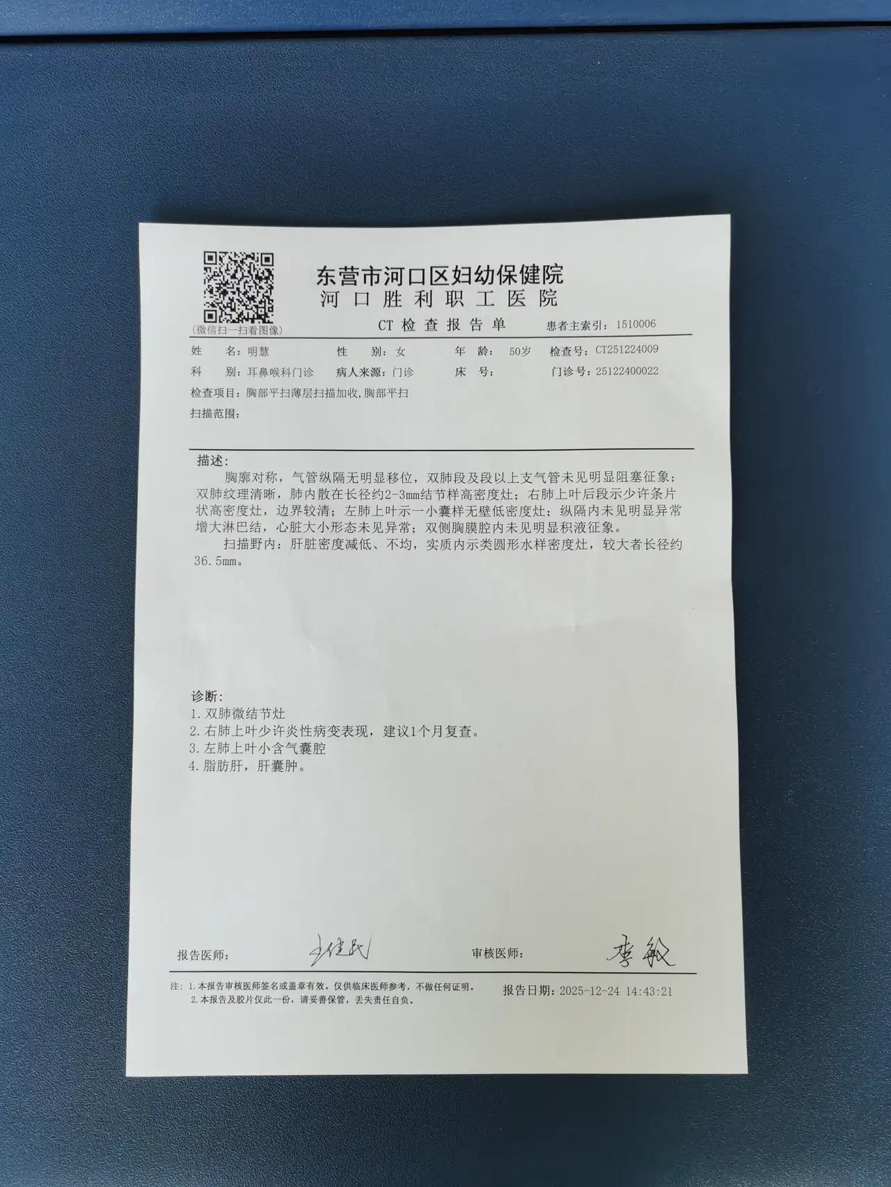 【看看检查结果这是死不了啦吧】 2025年12月24号,因为口吐血去做了一个检查,当时也没确证什么原因,让一个月以后再去复查,提着一颗忐忑不安的心回到家里,也不想吃也不想喝,人整整瘦了10斤,就担心会查出不好的东西{癌症}今天又去复查了,原来没啥事,这不是自己吓自己吗?其实真是人们所说,癌症并不可怕,可怕的是自己吓自己,好多得了癌症的病人,没等病死就把自己早早吓死,我就是一个很好的例子。请帮我看看这份检查报告!是死不了啦吧?祈祷🙏我还有好多好多的事都没有完成!我可不想走那么早!!!