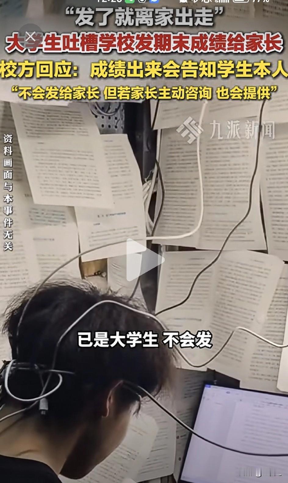 大学生期末也怕家长查岗?高校要发成绩单,学生急喊“我要离家出走”! 大学生期末考完最怕啥?——挂科?补考?不!是学校要给家里寄成绩单! 最近四川遂宁一所高校就被学生“火速问政”:网友在官方平台紧急留言,字字泣血——“学校给家长发成绩,发了我就要离家出走!” 学校:别急,还没发呢! 眼看这届大学生“求生欲”爆棚,学校赶紧出来澄清: 招生办:“不发的!大学生了,我们懂!” 学生处:“成绩还没出呢!平时只告诉学生本人,但家长真要问……我们也不好瞒着啊。” 翻译一下就是:咱不主动寄,但你也别太浪,爹妈真来电查岗,学校也挡不住啊! 其实这事儿,高校圈早有各派“武功秘籍”: ♻️“全员通报派”:直接把成绩单或《致家长的一封信》寄到家,科目分数一目了然,家庭氛围瞬间进入“期末总结会”。 ♻️“精准打击派”:只针对挂科多、学业预警的同学联系家长,俗称 “你家孩子可能要留级了,速来!” ♻️“佛系放养派”:成绩只对学生公开,家长想知道?自己问孩子去! 网友吵翻了:大学生算不算“宝宝”? 评论区秒变辩论现场: ✅支持派: “交那么多学费,家长凭啥不能知道成绩?” “有些孩子期末全靠‘意念复习’,没家长监督真不行!” “知情权懂不懂?我娃要是挂科了学校还不说,我得急死!” 🈲反对派: “大学生了!18岁能参军,20岁能结婚,成绩还要告家长?” “这是培养巨婴吗?该学会自己负责了!” “我爹妈看到我60分的专业课,可能以为我要辍学打工……” 💤中间派: “我可以自己告诉爸妈,但学校别偷偷‘告状’啊!” “建议开通‘家长查询需学生授权’功能,互相留点面子……” “成绩可以发,但能不能附上‘全班平均分’?不然我爸总以为我考倒数……” 说到底,这场“成绩单战争”背后藏着两代人的心理拉锯: 🚫孩子怕的不是分数,是那份“我都上大学了还被当小学生管”的窒息感。 🚫家长要的也不全是排名,而是“孩子在外过得好不好”的那份心安。 时代变了,以前大学是“解放区”,现在成了“家校联动新阵地”。 但真正该成长的,或许不只是学生——家长要学会放手,学校要把握分寸,而社会得接受:不是每个大学生,都能活成“别人家孩子”的模板。 如果一份成绩单就能引发家庭危机……那大概问题不只出在分数上。 教育的终点,从来不是学会考试,而是学会对自己的人生负责。 你家的大学生会把成绩告诉家长吗?你是否支持大学寄成绩单给家长?评论区一起聊一聊! 素材来源:九派新闻,侵联删!