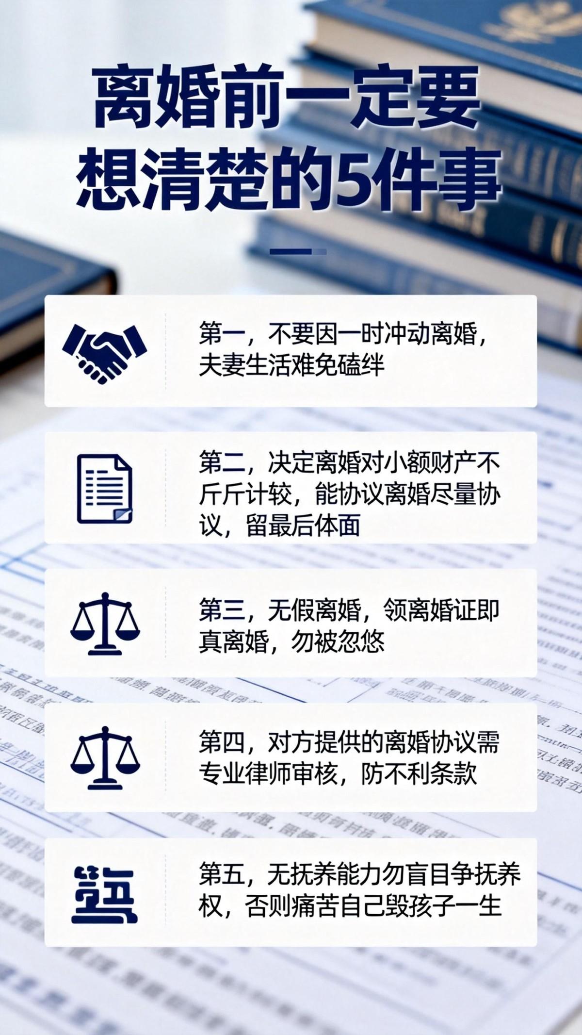 一位博主列出了五条关于离婚前必须想清楚的具体建议。 从别为小事冲动 到协议优先保
