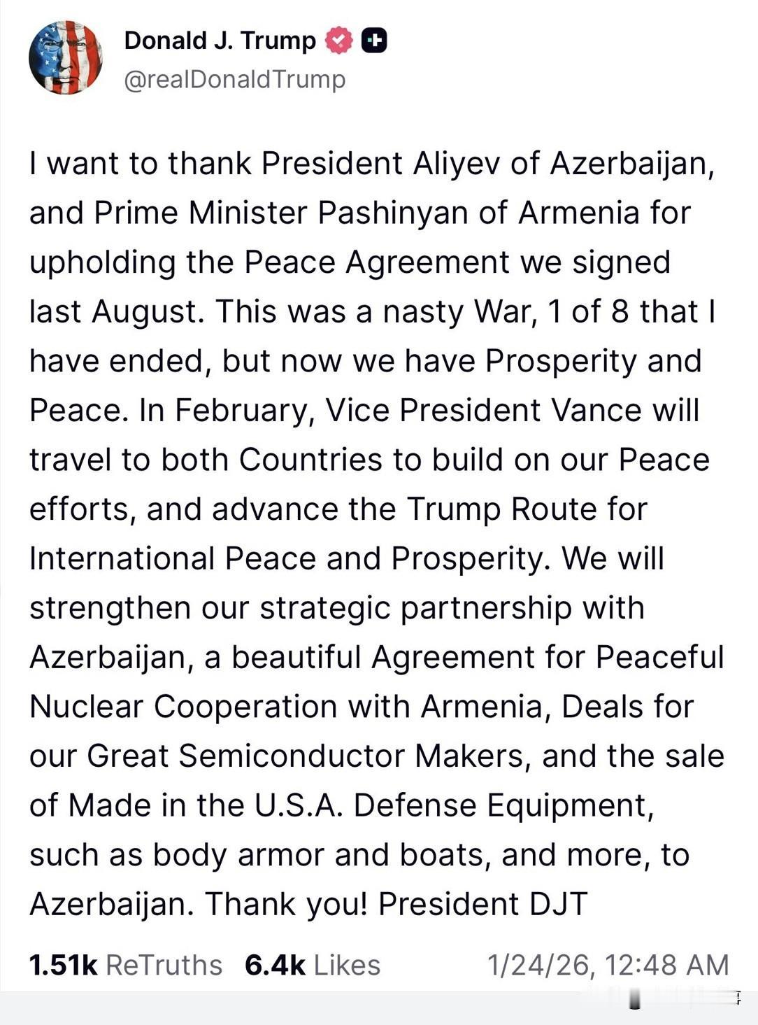 🇦🇿🇦🇲⚡️ — 美国总统特朗普: “我要感谢阿塞拜疆总统阿利耶夫和亚美尼亚总理帕希尼扬,他们坚持执行我们去年(2025年)8月签署的《和平协议》。这场战争非常残酷,是我结束的八场战争之一,但如今我们迎来了繁荣与和平。 (2026年)2月,副总统万斯将访问两国,继续推进我们的和平努力,并推进特朗普国际和平与繁荣路线图。 我们将加强与阿塞拜疆的战略伙伴关系,与亚美尼亚达成和平核合作的美好协议,为我们的半导体巨头达成交易,并向阿塞拜疆出售美国制造的国防设备,如防弹衣、船只等更多产品。”
