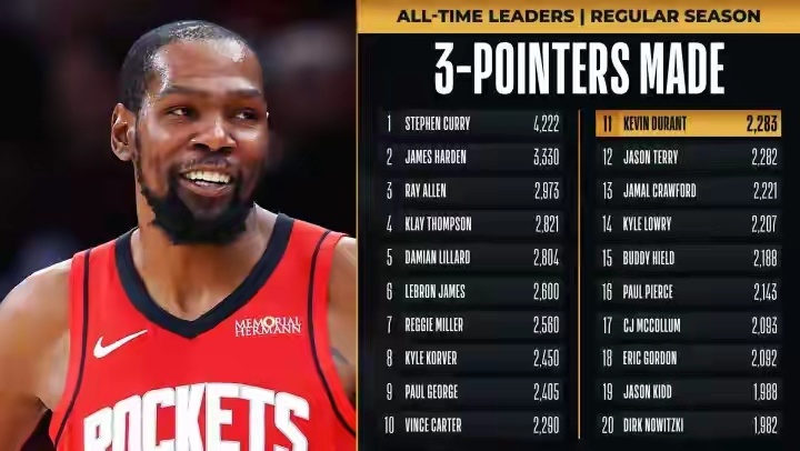 NBA NBA常规赛,火箭对阵活塞。本场比赛上半场,杜兰特命中两记三分,生涯三分数来到2283个,超越贾森·特里,升至NBA历史第11,排在第10的是文斯·卡特(2290个)。nba点赞成金