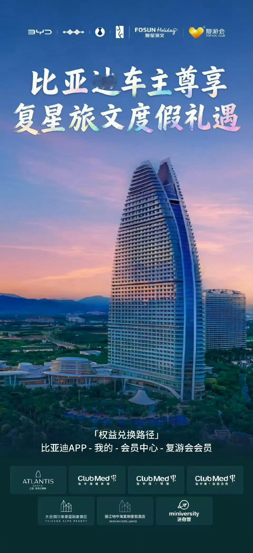 王传福再次为车主们带来惊喜!全球旅行礼遇等待解锁。还记得此前比亚迪与复星旅文达成合作的消息吗?如今首个合作成果已落地——双方实现会员互通,比亚迪车主权益再次升级。这意味着,比亚迪车主可通过比亚迪App直接兑换复游会的高等级会员会籍,轻松享受包括三亚·亚特兰蒂斯、Club Med地中海俱乐部等在内的全国多个高端度假目的地的专属礼遇。复星旅文作为全球知名的旅游度假集团,拥有超过2000万会员,其旗下的复游会更是专注于为会员提供度假预订、积分权益兑换等一站式高端服务。此次惊喜覆盖比亚迪旗下全品牌(比亚迪、方程豹、腾势、仰望)车主。选择一款合适的车,处处都可能遇见惊喜!