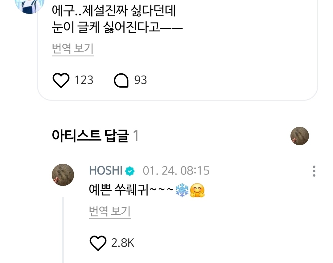HOSHI今天的行程- HOSHI:嘿嘿 我早上就开始除雪作业- 粉丝:啊 除雪可讨厌了 雪都变得很讨厌- HOSHI:好看白白的垃圾