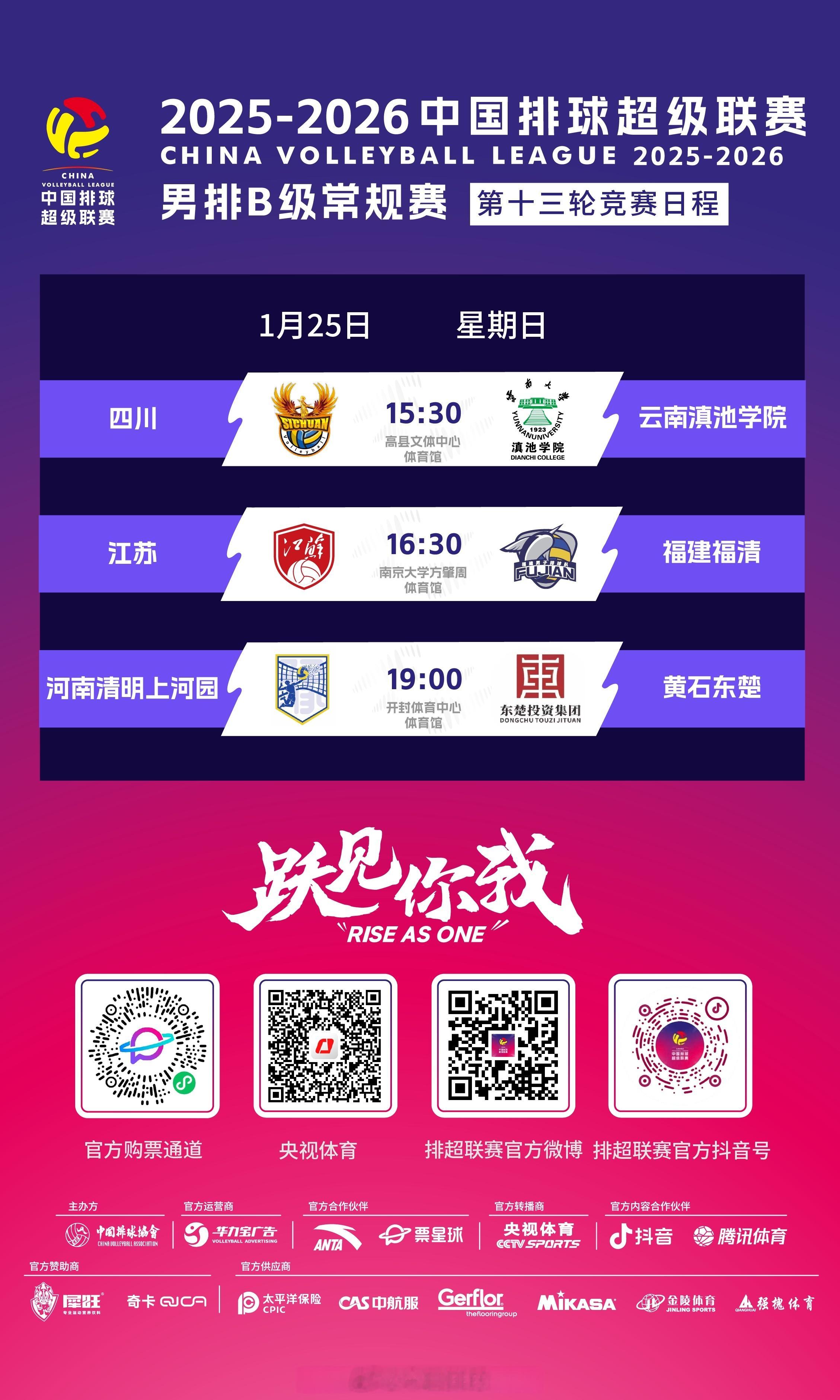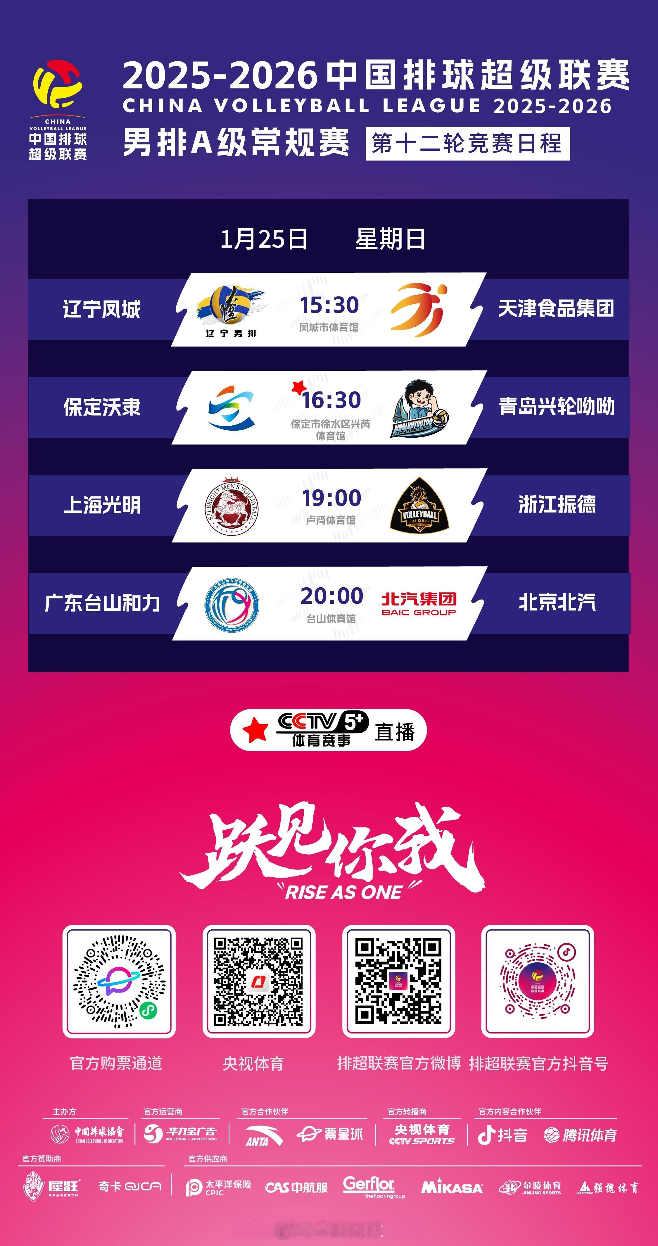 2025-2026中国男排超级联赛 A级常规赛第12轮和B级常规赛第13轮的较量,明天(25日)下午至晚上展开,具体的竞赛日程是:1月25日(日)A级——15:30 辽宁凤城 vs 天津食品集团16:30 保定沃隶 vs 青岛兴轮呦呦(CCTV5+)19:00 上海光明 vs 浙江振德20:00 广东台山和力 vs 北京北汽B级——15:30 四川男排 vs 云南滇池学院16:30 江苏男排 vs 福建福清19:00 河南清明上河园 vs 黄石东楚* 比赛在央视频、央视体育APP、抖音/排超联赛、微博/等全程直播;标注有台号的场次,在电视频道同时直播。