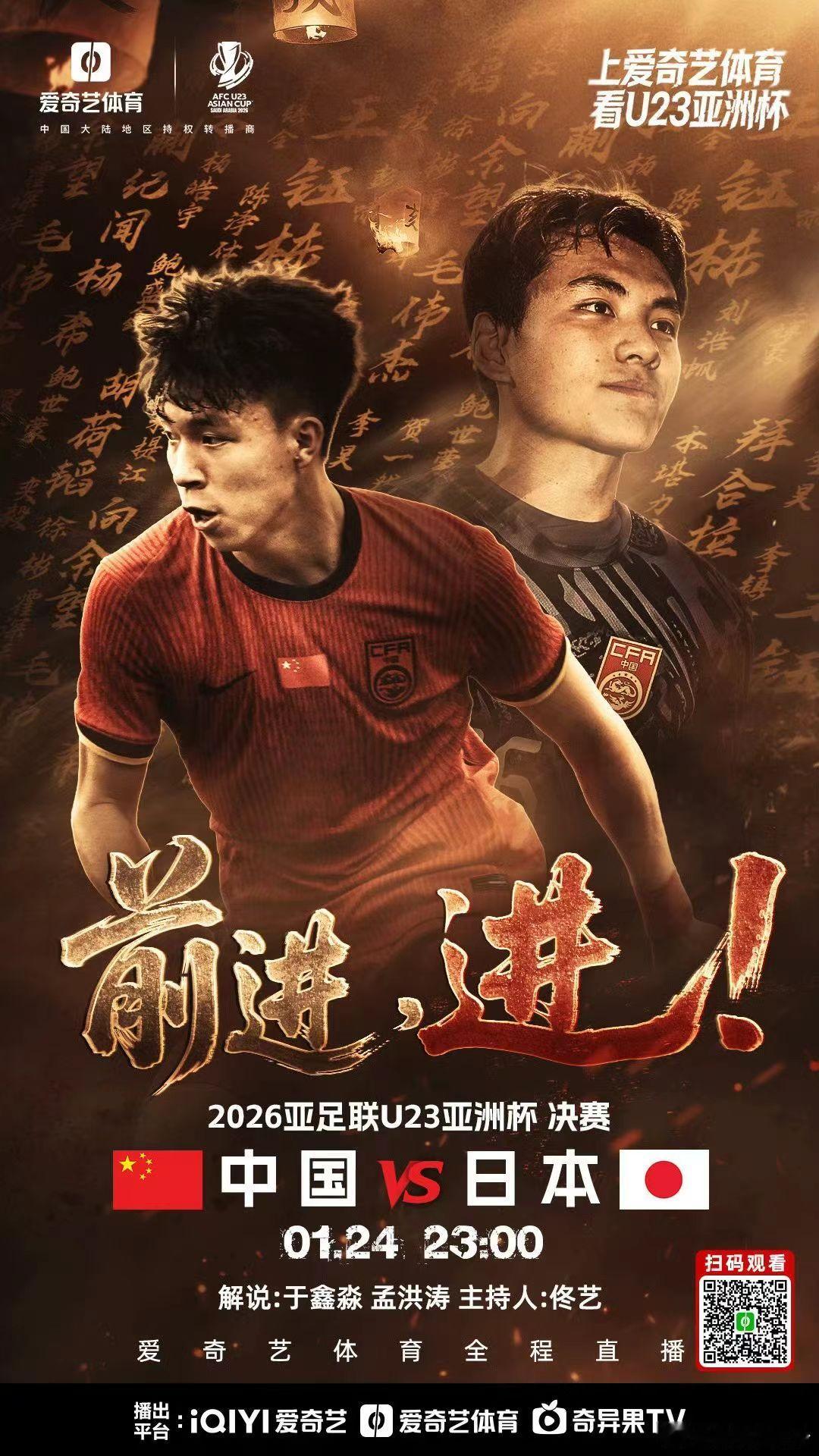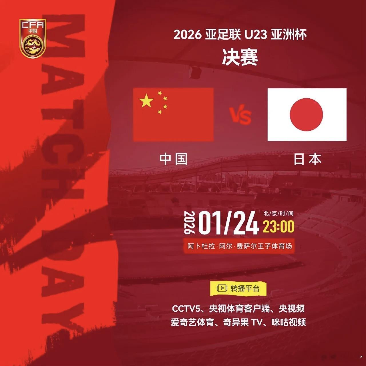 今晚,U23亚洲杯决赛,中日对决! 22年的等待,我们一起战斗!期待中国队取得胜