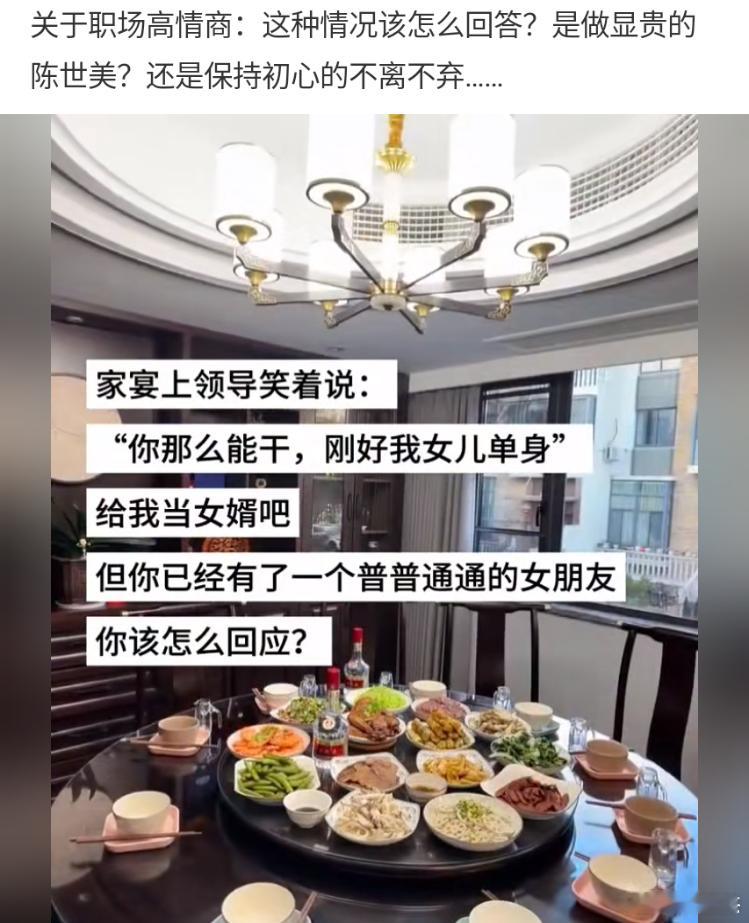 家宴上你领导笑着对你说:“你那么能干,刚好我女儿单身,给我当女婿吧。”但你已经有了一个普普通通的女朋友,此时高情商的你会怎么回复?