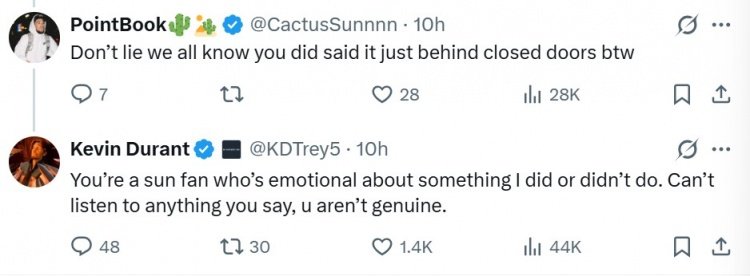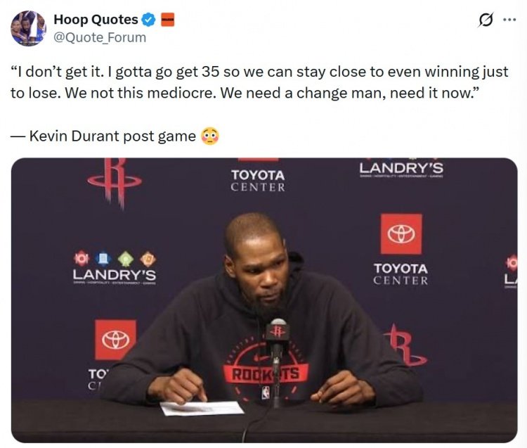 昨日赛后美媒【造谣】杜兰特赛后采访:“我不明白。我必须拿到35分才能勉强保持比赛的悬念,结果还是输球。我们不应该这么平庸。我们需要改变,现在就需要。哦不,我得去做我的工作了。无论输赢,我还是能拿到数百万的报酬。”杜兰特回应:“你们真的认为这些话是从我嘴里说出来的吗,兄弟??”小阳人:“不要撒谎,我们都知道你只是在私底下说了而已。”杜兰特回复:“ 你不过是个因为我做了或没做什么而情绪激动的太阳队球迷。我无法听取你的任何意见,因为你并不真诚。”火箭战胜活塞老鹰战胜太阳休斯顿火箭