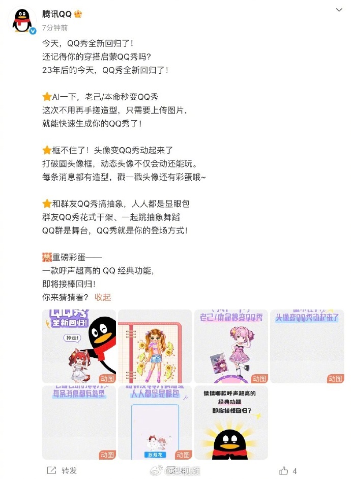 【#QQ秀宣布回归#,#QQ秀居然还在更新#】1月24日,腾讯QQ宣布QQ秀回归