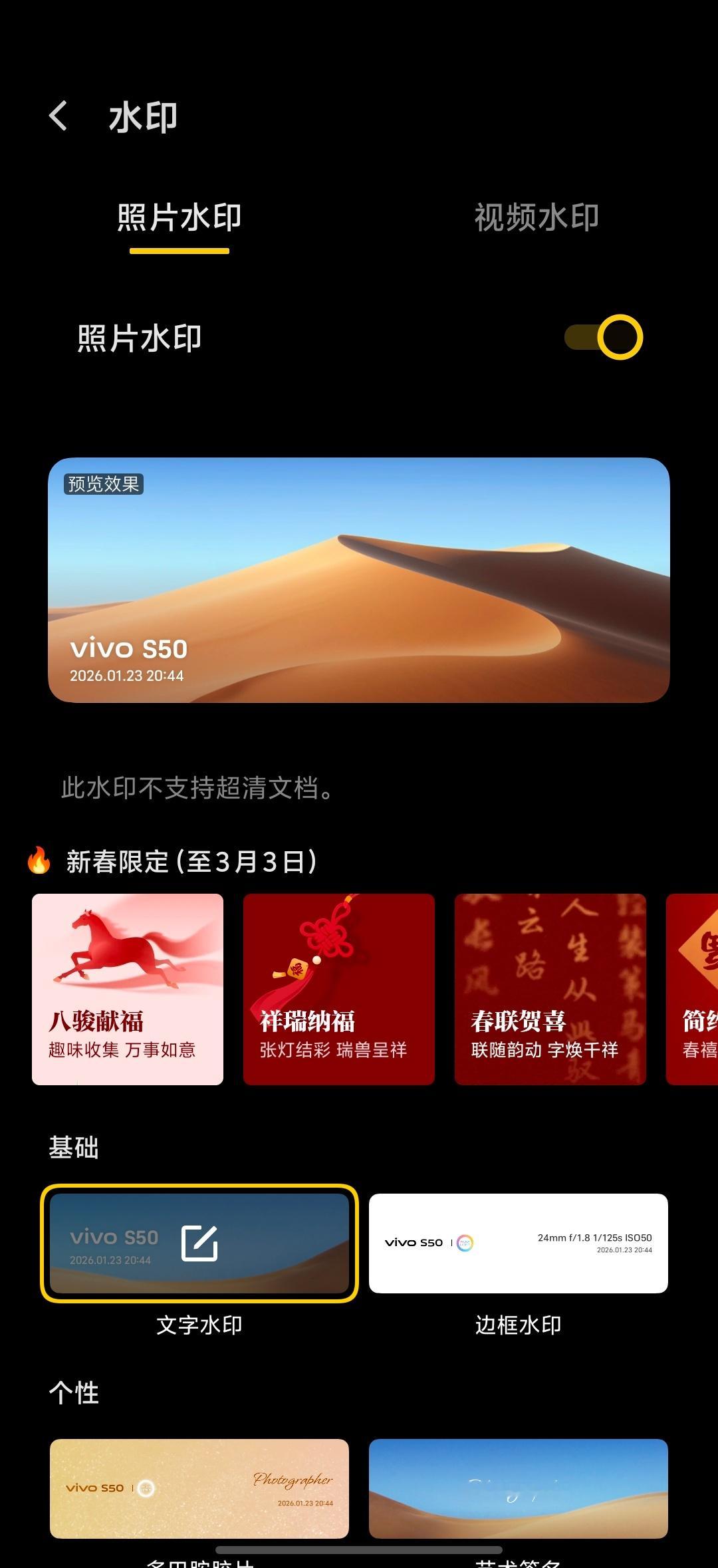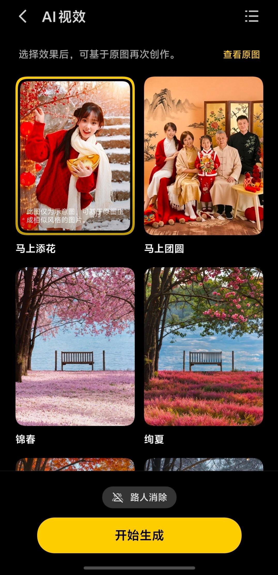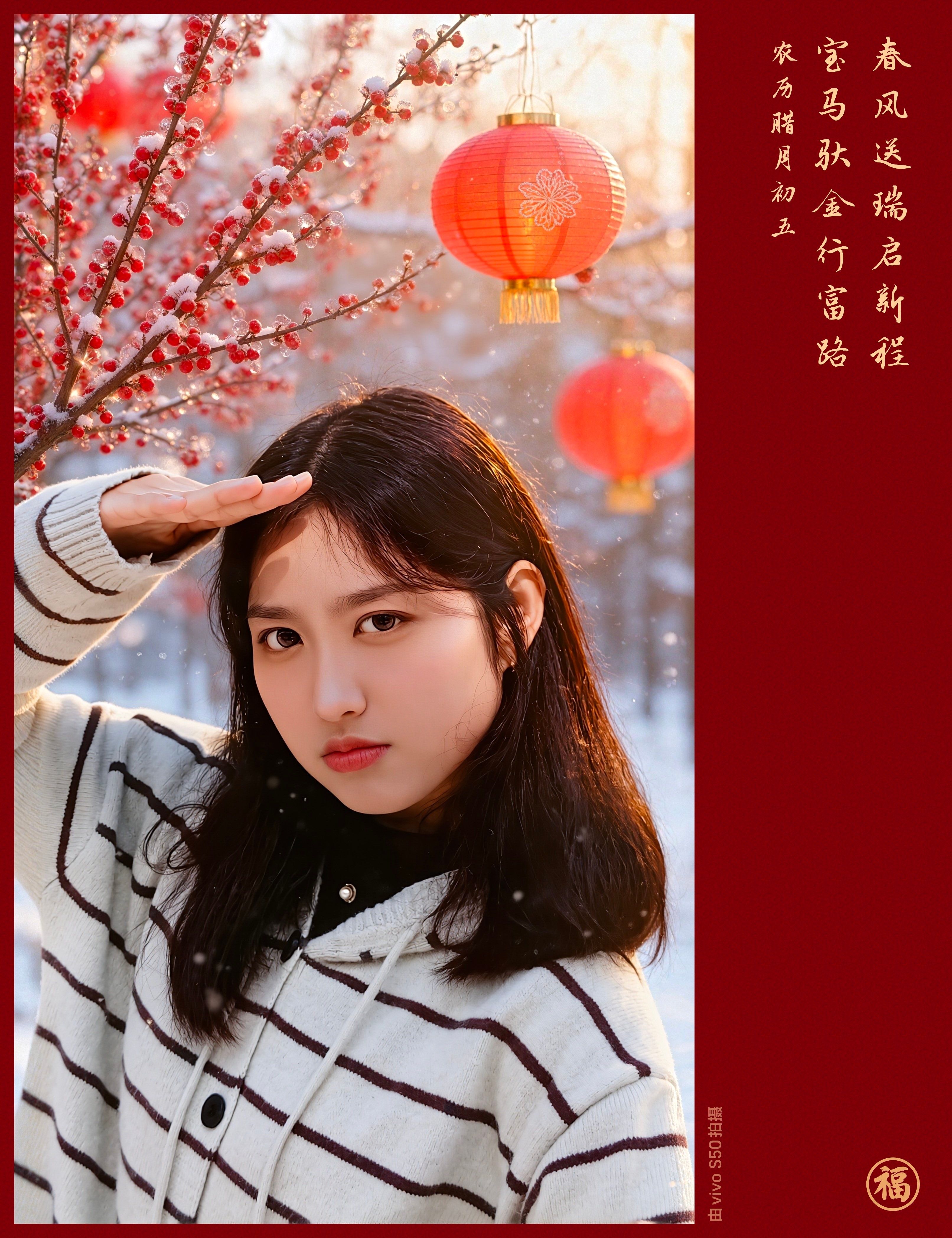 vivo玩家看过来!1月23号必做一件事:打开S50的相机人像模式,点开「AI视效」!里面新上的“新春”特效简直是春节合影救命神器!有“马上变身”,一键给你穿上拜年服,可爱到炸;“马上添花”会在头上加绒花发饰,年味十足;蕞绝的是“马上团圆”,能智能生成温馨的全家福背景!操作巨简单,选中效果,镜头对准人脸,AI自动识别生成!再也不怕拍不出好看的拜年照了,全家老小都能玩,拍出来的效果真实又自然,直出就能当电子贺卡发!过年社交硬通货,就是它了~