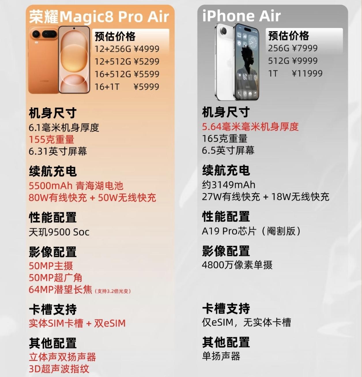 没有对比,就没有伤害[捂脸]苹果这是把果粉当大冤种整啊,说好的轻薄旗舰在Magic8 Pro Air面前显得像小丑。 iPhone 17 Air除了性能毫无亮点可言,电池小的可怜,单摄还价格虚高。反观荣耀Magic8 Pro Air,要性能有性能,影像也是拉满,主摄、广角和潜望长焦没一个凑数的,电池5500mAh的情况下,还做的比苹果轻薄,而且可以SIM卡和eSIM都支持,孰强孰弱一目了然。