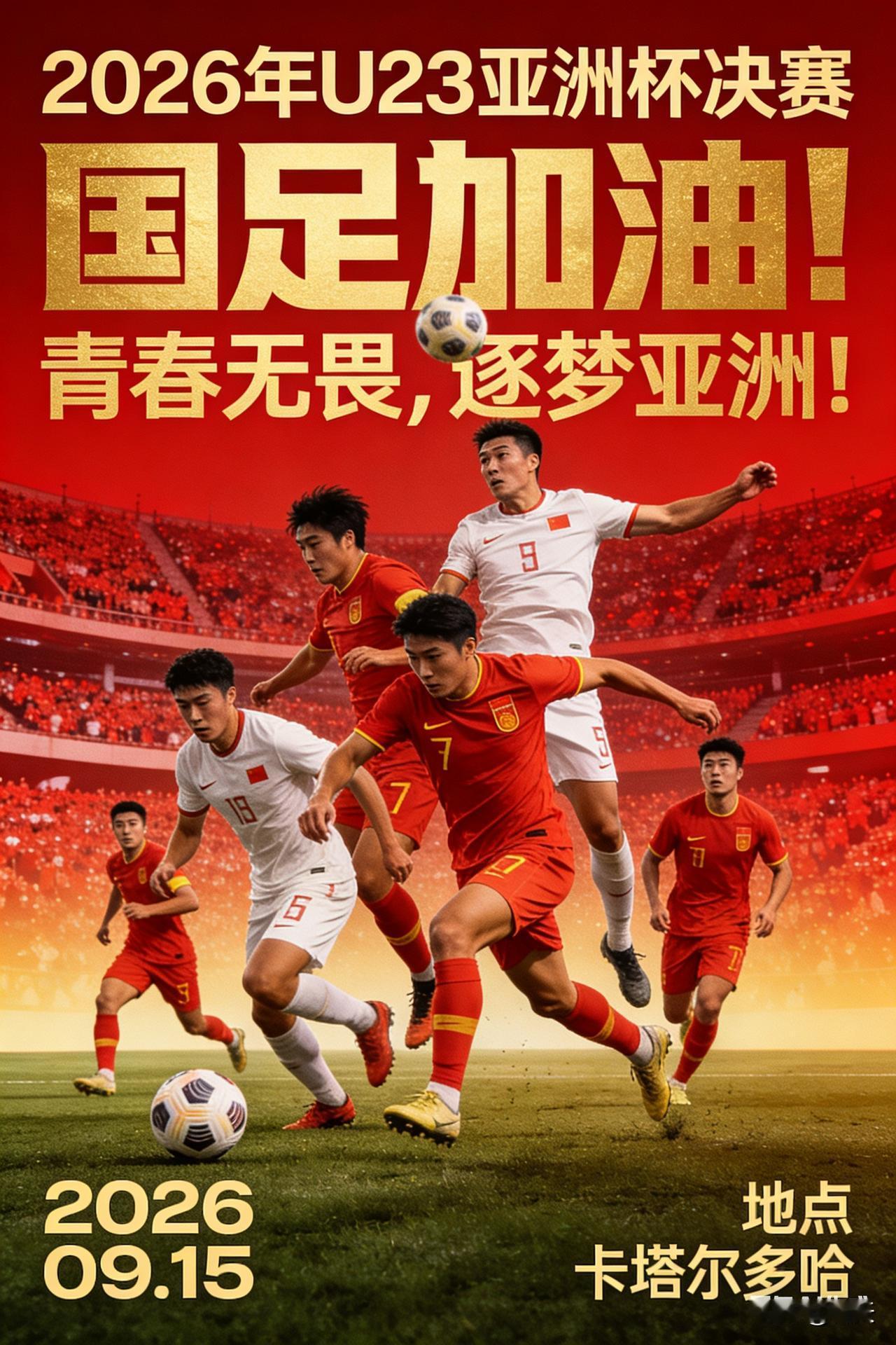 为国足呐喊,为拼搏喝彩 2026年U23亚洲杯决赛号角即将吹响,今晚23:00,中国U23国足将与日本队正面交锋,向冠军荣誉发起冲击。 赛前备战阶段,小伙子们斗志昂扬、全力以赴,23名将士秉持“尽自己最大努力去战斗”的信念,早已做好拼到底的准备。每一次训练的汗水,每一次战术的打磨,都是为了在决赛场上绽放光芒。 这场对决不仅是实力的较量,更是青春与热血的碰撞。让我们一同锁定CCTV5,为中国U23国足呐喊助威,见证他们在赛场上勇往直前,用拼搏书写属于中国足球的精彩瞬间 需要我制作热血助威风图文卡片,用红金配色搭配赛事信息,方便分享为国足加油吗?