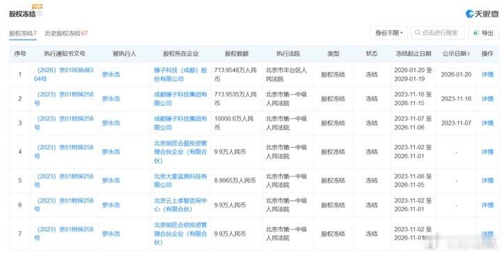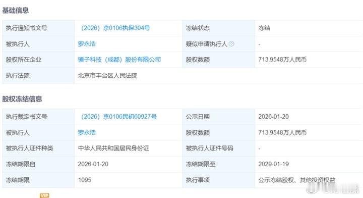 难道“真还传”要烂尾?罗永浩713万股权再遭冻结,背后真相如何?罗永浩再次因股权冻结重回舆论中心。2026年1月20日,罗永浩持有的锤子科技(成都)股份有限公司约713万元股权被北京市丰台区人民法院依法冻结,期限为三年。并非新增个人债务。此次冻结实质上是锤子科技作为法人主体的旧债纠纷所致,而非罗永浩个人新增债务。事实上,罗永浩已于2025年底基本清偿完毕个人担保债务,此前更累计偿还了含公司债务在内的8.24亿元。冻结诱因直指旧案。知情人士透露,此次动作源于郑刚旗下紫辉创投的一笔1500万元公对公借款纠纷。由于罗永浩持有该公司22.67%的股份且担任董事长,其股权成了法院保全资产的常规操作。这意味着在未来三年内,这部分股权不可转让或质押,但所有权并未丧失。法务余波难以速结。尽管罗永浩个人“讲义气”扛下了许多非法定责任,但锤子科技目前仍背负超2142万元的执行标的及多条限制高消费令。这表明创业留下的烂摊子即便在个人债务清零后,依然存在较长的司法“尾巴”。观察视角:股权冻结是法律对企业债务的常规保全,并不等同于“翻车”,但它提醒创业者,即便个人上岸,法人主体的历史遗留问题仍可能通过股权关联长期束缚个人资产的流动性。罗永浩所持锤子科技713万股权被冻结锤子科技714万股权被冻结罗永浩被冻结713万股权