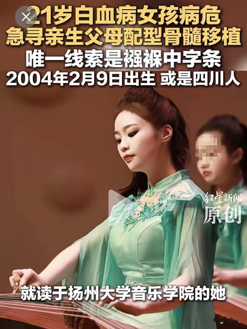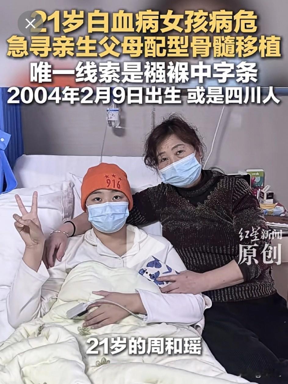 22岁女大学生病危急寻亲生父母:22年前襁褓里一张纸条,藏着我的命! “让她争气长大,我才放心。” 2004年2月9日凌晨5点半,贵阳太慈桥,一个刚出生的女婴被放在襁褓里,旁边压着一张纸条。 纸条上歪歪扭扭地写着: “我是四川人,回家交不起钱,才把这女儿抱出来……望好心人把她养大孝敬您。” 这个女孩就是周和瑶。 22岁的周和瑶本该在扬州大学音乐学院读大四,准备考研。可去年7月,一场高烧改变了一切。 “白细胞异常”—— 检查结果像一记重锤。 她从扬州飞回贵阳,确诊了急性混合细胞白血病。 确诊两个月后,她无意中在养父手机里看到了收养证照片。 “原来我不是亲生的。” 但善良的她选择沉默:“养父母不说,一定有他们的顾虑。” 周家原本条件不错,可高二那年家里生意失败,房子全卖了。 现在一家四口租住在月租600元的红砖房里,养母退休金1000多,养父打零工。整个家庭,倾尽所有的爱,只求为她救命! 为给她治病,学校举办募捐音乐会,社区申请补助,网络筹款……能试的都试了。 但是,化疗、复发、病危通知书……紧紧扼住周家的咽喉。 今年1月10日,周和瑶在病危通知书上签下了自己的名字。 医生说:“找到有亲缘关系的人配型,成功率会高很多。” 养母姚女士含泪说:“我们不求别的,只求他们能来做个配型,给孩子一次生命的机会。” 周和瑶写下一段话: “我不怪你们当年的遗弃,或许有难言之隐。也不求补偿,只求你们能来医院做一次配型检测。” “此刻,我真的需要这份血缘带来的生机。” 19年前的那张纸条,成了唯一线索: 🍒出生地:贵阳太慈桥; 🍒出生时间:2004年正月十九,凌晨5:30; 🍒关键信息:“我是四川人”。 养母记得,那天是2004年2月9日,爷爷在贵阳市乌当区松溪路建安小区门口捡到了这个女婴。 如果您认识2004年前后在贵阳的四川籍夫妇,或者有任何相关线索,请帮帮这个女孩! 她不要财产,不要相认,只要一个活下去的机会。 网友热评: “22年前你给了她第一次生命,22年后,求你再给她第二次生命!” “养父母太伟大了,倾家荡产也要救女儿!” “四川的老乡们,帮忙扩散啊!” 愿生命奇迹发生! 为优秀的女孩祈福[祈祷][祈祷][祈祷] 素材来源:红星新闻,侵联删!
