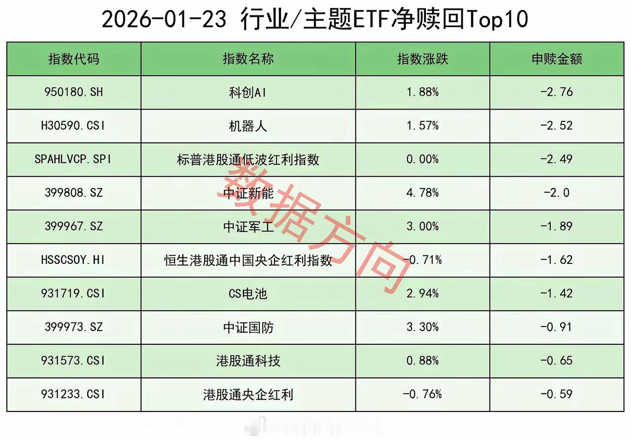 狂卖4000亿,多头转空头1月23日星期五,大盘再度放量攀升。商业航天、光伏掀涨停板,贵金属延续强势,另一边,银行、保险、煤炭跌幅居前。上证指数涨幅0.33%,上交所股票型ETF合计净赎回648.39亿元。这是其连续第7天净赎回,7天累计4084.08亿。这是一个非常大的数据,以前很多时候,一年也净申购不了这么多。大概的流程是:1)1层在二级市场卖出ETF;2)机构和大资金接盘后将其赎回成一揽子股票,然后在二级市卖掉,进行套利交易;3)赎回后也可以不卖出,而是把股票留在手上,如果是此种情况,考虑到上证50已9连阴,沪深300阴跌不止,则很有可能把肉烂在手里。关键在于,卖了如此多之后,大盘不仅没有下跌,反而还能逆市上涨。宽指中证500指数(20.35亿)、科创50指数(6.12亿),净申购居前。科创100指数(1.85亿)、科创创业50指数(0.3亿)、上证180指数(0.12亿),分别被小幅净赎回。沪深300指数(-586.09亿),被大幅净赎回近600亿。之前救市的时候,1层买沪深300最多,大蓝筹也率先得以稳定下来,风水轮流转,当年的多头变成了现在的空头,往外卖的时候同样“遥遥领先”。中证1000指数(-99.33亿)、上证50指数(-71.13亿),净赎回亦不在少数。中证A500指数(-7.55亿)、上证指数(-0.11亿)、中证A50指数(-0.06亿),分别被小幅净赎回。行业和主题 科创芯片指数(18.97亿)、半导体指数(4.09亿)、科创半导体材料设备指数(3.5亿),一起进入申购榜;细分化工指数(7.08亿)、有色金属指数(5.76亿)、细分有色指数(5.31亿)、SSH黄金股票指数(3.9亿),一起进入申购榜。其他进入申购榜的还有:光伏产业指数(7.93亿)、中证传媒指数(5.47亿)、房地产指数(4.49亿)。标普港股通低波红利指数(-2.49亿)、恒生港股通中国央企红利指数(-1.62亿)、港股通央企红利指数(-0.59亿),一起进入赎回榜。中证新能指数(-2.0亿)、CS电池指数(-1.42亿),一起进入赎回榜。中证军工指数(-1.89亿)、中证国防指数(-0.91亿),一起进入赎回榜。其他进入赎回榜的还有:科创AI指数(-2.76亿)、机器人指数(-2.52亿)、港股通科技指数(-0.65亿)。
