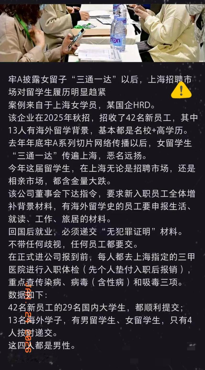 某国企要求有海外留学经历提交体检报告,女性无一报告。牢a关于女留子的直播,女留子的反应很有趣。其实这背后藏着的,是留学生群体的真实分层,舆论的热议不过是把这层窗户纸捅破了而已。 正经啃书本的理工科女留子,大多认牢A的说法,即便心里不舒服也不愿发声,毕竟当下留学生的舆论环境本就不占优,拿出真本事反驳也容易被无脑围攻,索性沉默做事。反倒是那些花大钱镀金买水硕、在国外私生活混乱的女留子,被戳中痛处彻底破防,在各大社交平台上跳脚辩解,越吵越暴露心虚。 说到底,舆论从不是针对所有留学生,而是对“假留学真享乐”的戳穿,国企的体检要求和牢A的直播,不过是照妖镜,照出了留学的真实成色。真有真才实学的,从不怕外界的审视,只有虚有其表的,才会怕被扒开伪装。你觉得当下对留学生的舆论审视,是过于严苛还是理所应当?