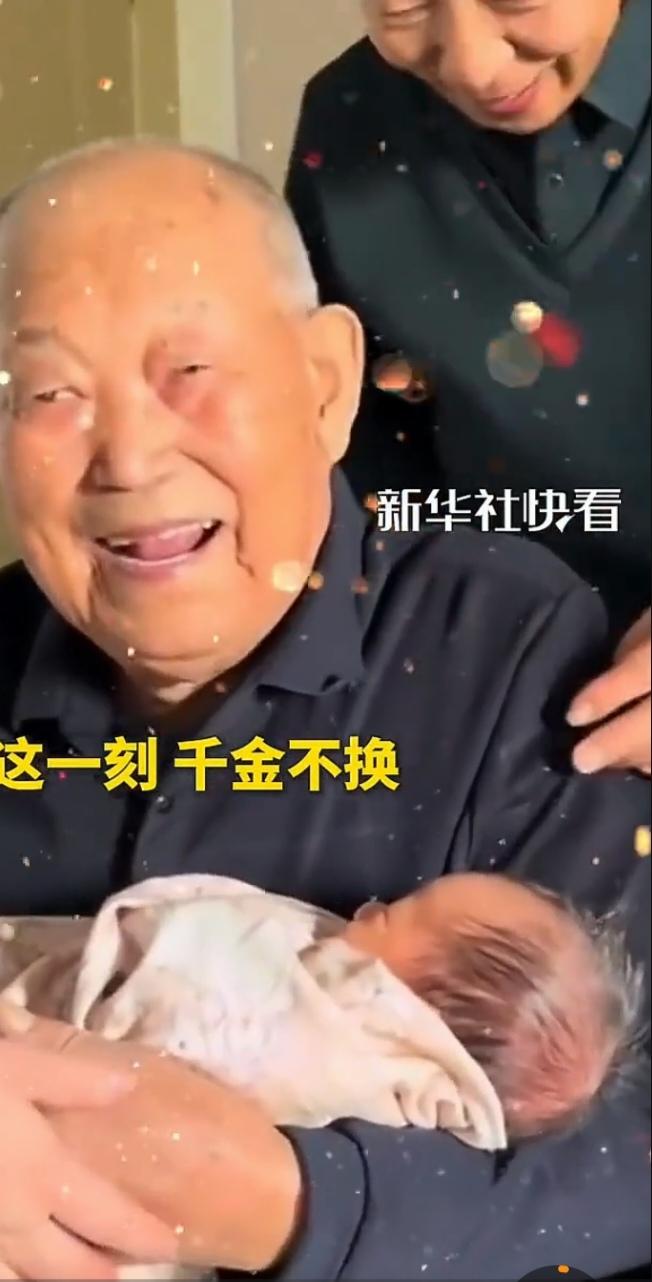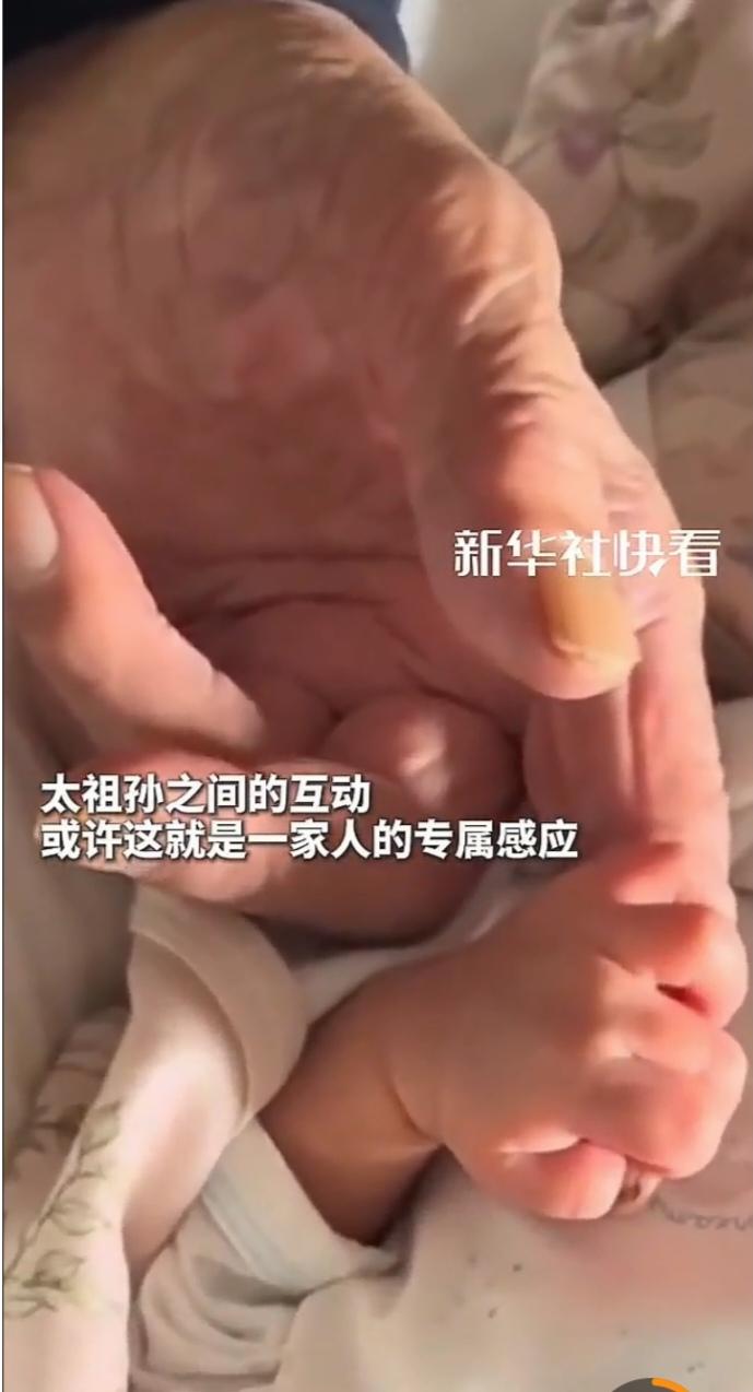 百年牵一手,家暖岁长宁 106岁的太姥爷和刚出生的重孙,隔着106年的岁月对望——这画面,比老照片还戳心窝子。 腊月的暖阳斜斜照进堂屋,太姥爷穿着藏青色棉袄,枯瘦的手搭在膝盖上,眼神却直勾勾往门口飘。当抱着重孙的儿媳走进来,老爷子浑浊的眼睛瞬间亮了,像突然点燃了两簇小火苗,头微微前倾,连呼吸都轻了几分。 “爸,您瞅瞅重孙!”儿子把襁褓凑到跟前,太姥爷慢慢抬起手,指节皱得像老树皮,却小心翼翼绕开宝宝的小拳头,轻轻搭在那只比花生仁大不了多少的小手上。一老一小,一黑一白,一皱一平,两只手攥在一起的瞬间,屋里静得能听见时钟滴答。 太姥爷的目光黏在重孙脸上,挪都挪不开。宝宝打了个小哈欠,他嘴角就咧到耳根;宝宝蹬了蹬小脚丫,他就赶紧调整手的姿势,生怕硌着小家伙。“慢点,慢点”,老爷子声音沙哑却温柔,反复摩挲着那软乎乎的小手掌,像是捧着稀世珍宝。 旁边的亲戚们看得眼睛发热,二姑忍不住念叨:“家有一老便是一宝,家有一小便是一盼,这俩活宝凑一块儿,咱家的福气都要溢出来了!”可不是嘛,太姥爷经历过风雨飘摇,重孙降生在国泰民安,百年光阴在这一刻交汇,没有惊天动地,只有柴米油盐里的踏实。 有人掏出手机记录,太姥爷却摆摆手,眼睛还盯着重孙:“别拍,咱家人好好的,比啥都金贵。”这温馨的一幕,千金不换。就像老话常说,岁月催人老,亲情暖人心,跨越百年的牵手,牵起的是家风的传承,更是人间最朴素的幸福。太奶奶新重孙 太姥爷太奶奶