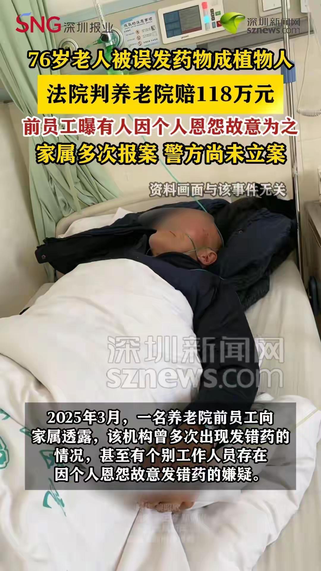 老人因误发药造成伤害肯定是养老院的责任,被判赔118万是应该的。这反映了养老院的管理混乱,也反映了员工素质不高,更说明需要有一定的医护人员才能干这样的活。但因此说老人因个人恩怨,被养老院员工故意发错药的可能性不大。老人本身已经76岁,且能进养老院的也不是身份特殊的人,员工故意发错药害人命值得吗?有什么样的矛盾可以下这样的狠手?即使害了老人性命,为年近80岁的老人承担刑事责任肯定不值得。前员工反映的事情可能有各种原因,比如员工之间的矛盾,比如前员工和养老院间的矛盾,也不能全信。