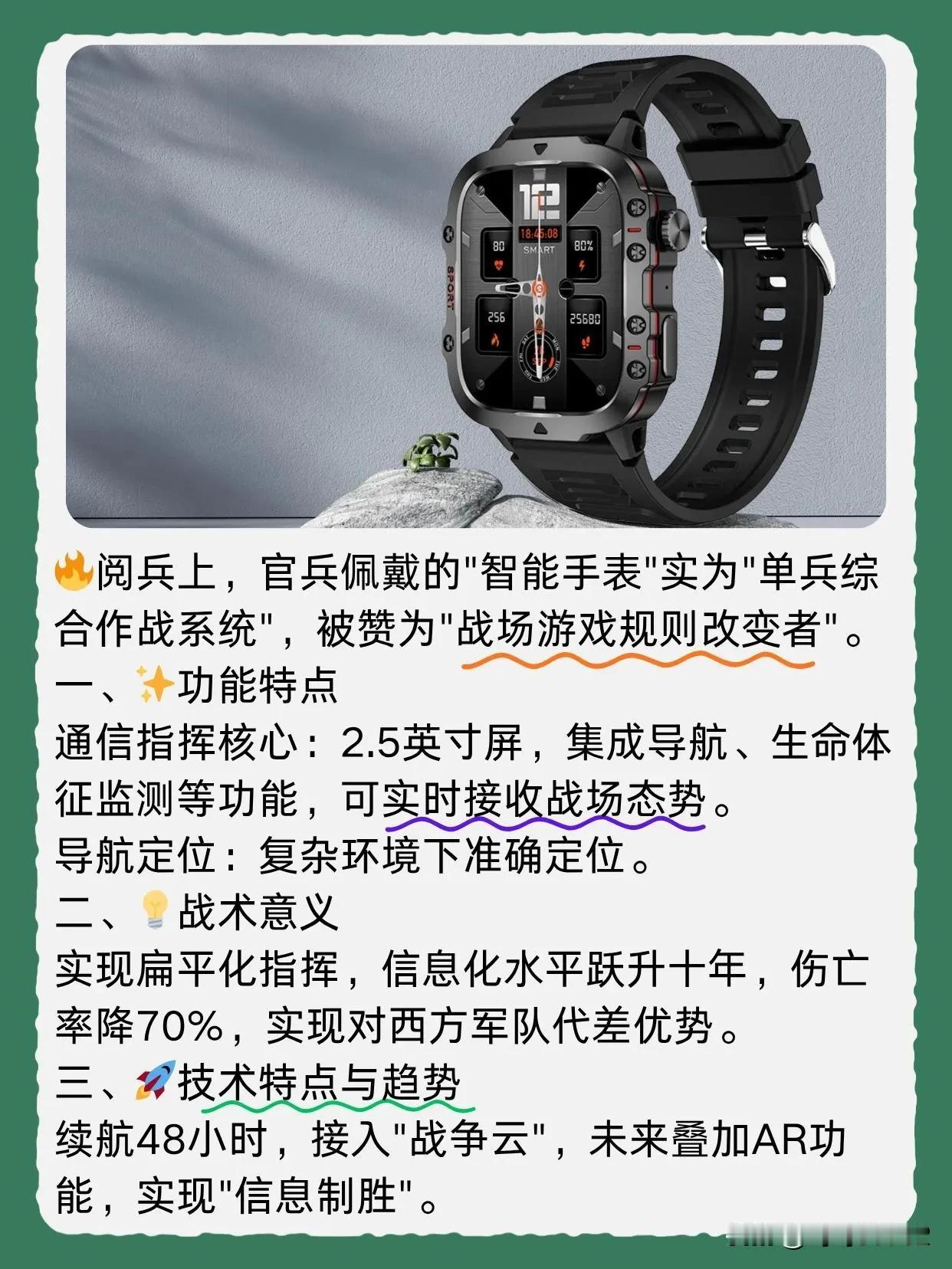 高原单兵综合作战系统 这是一套将科幻电影照进现实的装备系统。简单来说,高原单兵综合作战系统不仅仅是一套新衣服或新枪,它是一个将“人、枪、信息、无人装备”融为一体的高度智能化的“微型作战网络”。 如果说以前的士兵是一颗孤立的“棋子”,那么这套系统就是让他变成了战场上一个拥有“超级大脑”和“顺风耳”的智能终端。 以下为你深度拆解这套系统的五大核心黑科技: 1. 智能头盔:单兵的“移动指挥中心” 这不仅仅是防弹壳,而是一个集成了多种传感器的显示平台。 * 态势感知: 头盔上配有微型显示器(或护目镜),士兵无需探头就能在屏幕上看到队友的位置、指挥所的指令,甚至无人机传回的实时画面。 * 夜视与热成像: 配合多光谱夜视仪,士兵在夜间或烟雾中能清晰识别目标,真正做到“夜间如白昼”。 * 通信枢纽: 集成了降噪耳机和麦克风,支持加密语音通信,甚至能通过骨传导技术在嘈杂环境中清晰通话。 2. 武器火控系统:让子弹“长眼睛” 这套系统彻底改变了射击方式。士兵手中的步枪(如191式)不再只是机械结构,而是变成了“智能手机”。 * 一体化瞄具: 武器上集成了光电瞄准镜、激光测距仪和弹道计算机。 * 拐角射击: 士兵可以躲在掩体后,将枪伸出去,通过屏幕上的数据精确打击目标,无需暴露身体。 * 信火一体: 发现远处目标后,士兵可以通过终端直接将坐标发送给后方的炮兵或无人机,实现“发现即摧毁”。 3. 动力外骨骼与携行具:高原负重的“减负神器” 在高原,每走一步都像在平原背负两倍重量。新系统通过无源外骨骼(利用力学结构分散压力)和模块化背心,大幅降低了体能消耗。 * 模块化设计: 战术背心可以根据任务需求快速拆卸,比如攀登时卸下防弹插板,攻坚时加挂弹药。 * 快速解脱: 遇到落水或被俘风险时,士兵只需拉动拉环,整套装备即可瞬间脱落,保命第一。 4. 生命维持系统:极寒环境的“生存保障” 这是针对高原特有环境的“黑科技”。 * 单兵制氧: 配备小型便携式制氧机,能实时监测血氧饱和度,自动供氧,防止急性高原病。 * 恒温水壶: 采用纯钛材质和电加热技术,即使在零下几十度的环境中,也能随时喝上热水,这是目前全球独一份的配置。 * 净水装置: 可直接利用雪水或冰川水过滤成饮用水,解决了高原补给困难的问题。 5. 无人僚机:机器狗的协同作战 这是系统中最亮眼的“配角”。四足仿生机器狗(如“机器狼”或类似型号)可以伴随步兵行进。 * 功能: 它们可以背负重物(减轻士兵负重),也可以携带武器或侦察设备,甚至在危险区域充当“诱饵”或“突击手”。 📊 传统单兵 vs 高原综合作战系统 感知能力 肉眼观察,视野受限 全天候、全时段战场态势感知 看得远、看得清 指挥层级 班-组-个人,信息滞后 单兵直连指挥所,实时共享 决策快、反应快 负重体验 硬扛,体能消耗大 外骨骼分散压力,体感减半 机动性强、耐力久 生存能力 依赖个人意志和急救包 实时监测生命体征,一键呼救 救护快、存活率高 火力支援 呼叫炮火,坐标易错 激光定位,一键指示目标 打得准、毁伤快 💡 总结 这套系统的核心目的,不是为了把士兵变成“超人”,而是通过科技赋能,在极端恶劣的高原环境下,最大限度地减少非战斗减员,同时最大化地提升每一颗子弹的作战效能。它标志着我军步兵作战正式迈入了“智能化、网络化”的新纪元。