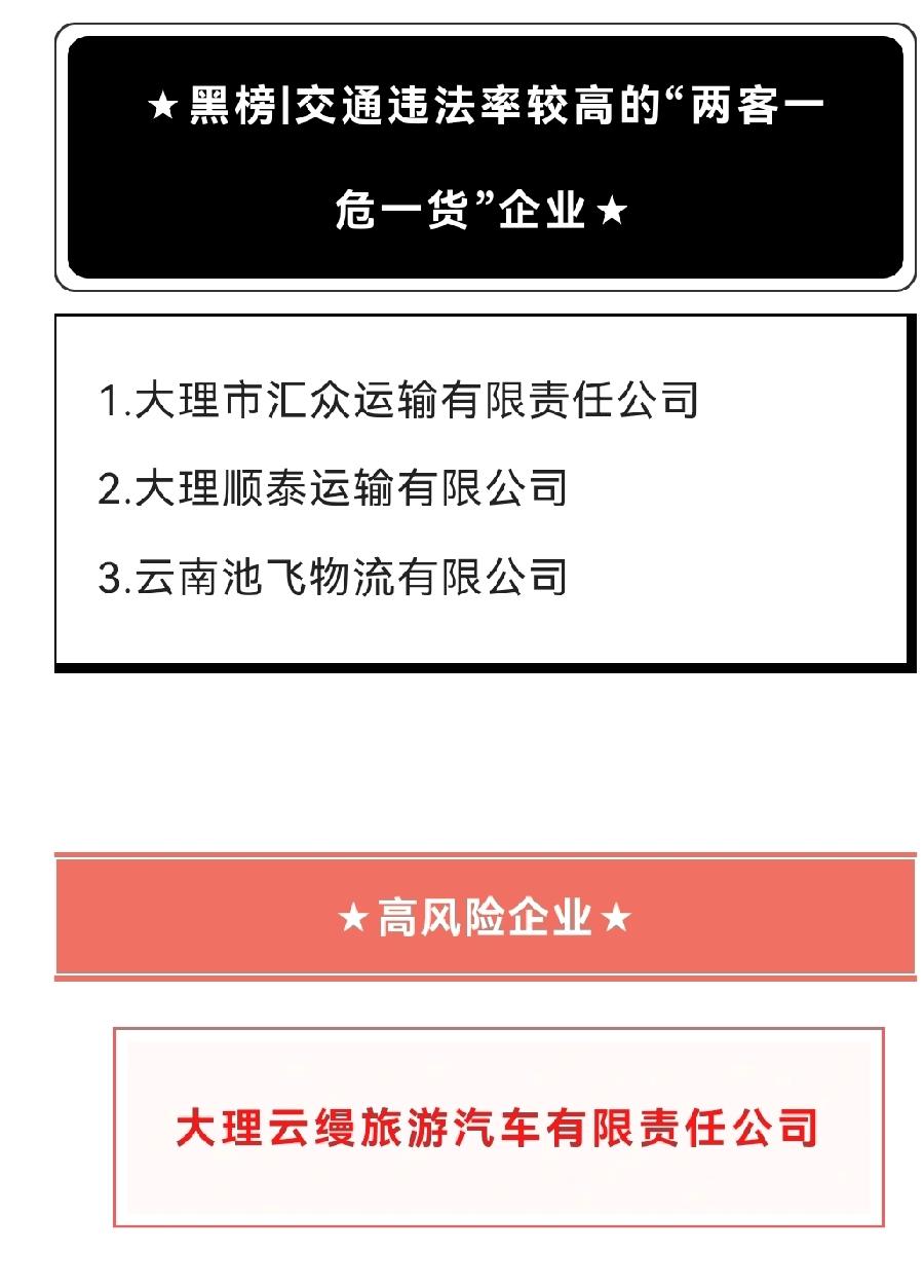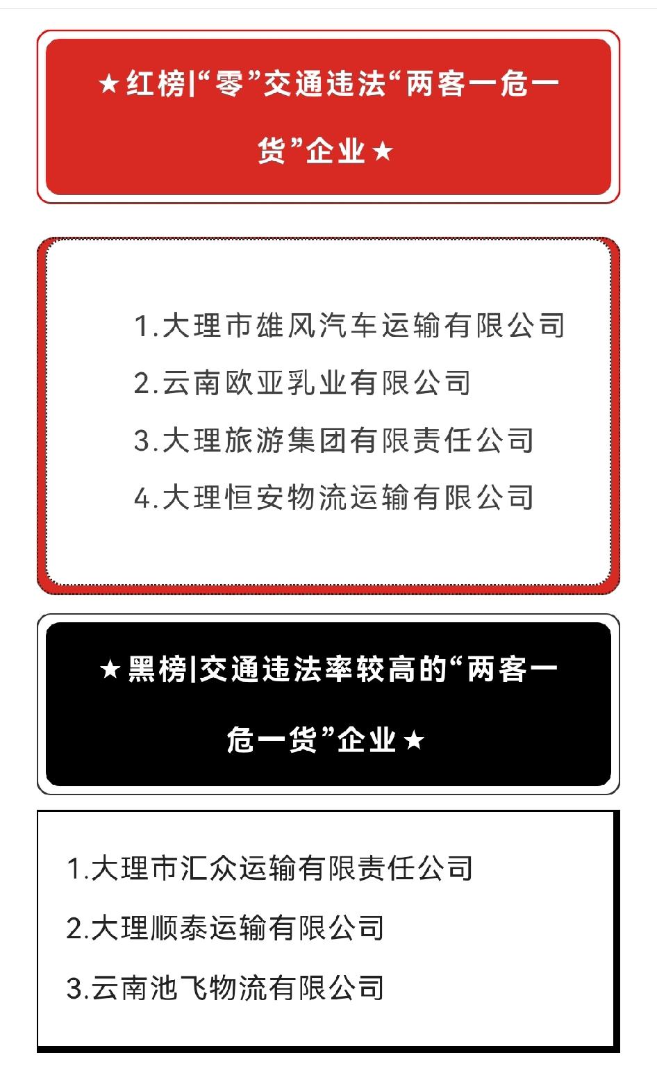 1月份大理3家交通运输企业被曝光 为全面推动运输企业落实交通安全主体责任,大理市建立了“两客一危一货”交通违法重点运输企业“红黑排行榜”,对零交通违法的“两客一危一货”优良运输企业进行通报表扬,对交通违法较多的“两客一危一货”运输企业进行曝光。 1月份大理市“两客一危一货”运输企业“红黑榜”→ 大理市警方提示:客货道路运输存在较大交通安全隐患,“两客一危一货”驾驶员严禁发生超员、超载、超速、疲劳驾驶、不系安全带、酒后驾驶、分心驾驶等交通违法行为,请驾驶员遵守道路交通法律法规,确保行车安全!