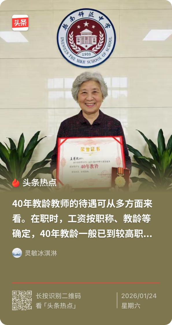 40年教龄:即将消失的教育“活化石”,退休后真无特殊待遇? “2031年退休时,我就能凑够40年教龄了。”1990年入职的小学教师感慨道。和几位同学相聚时,他们曾反复讨论:放眼全国,到2026年仍坚守讲台、教龄满40年的教师,究竟还剩多少?答案或许比想象中更稀少。 1986年及之前踏上讲台的教师,若2026年仍未退休,才算得上40年教龄的“存量群体”。这些老教师多是乡村或公办学校的中坚,历经教育改革的风风雨雨,如今已步入中老年。而女性教师想要达标,还得满足评上副高级、赶上延迟退休的双重条件,这般门槛让40年教龄更显“奢侈”。就像这位教师和他的同学,即便算上延迟退休政策,能达成目标的也寥寥无几。 更让人热议的是待遇争议:有人说40年教龄是“金招牌”,退休后必有特殊优待;也有人直言,如今都是社会统筹养老保险,教龄长短不过是缴费年限的数字差异。真相是,全国暂无统一的40年教龄额外补贴,但40年的缴费年限(教龄视同缴费年限)会让养老金比短教龄教师高出一档,部分地区还会在核算时给予小幅倾斜,只是这份“优待”远非传言中那般丰厚。 可对于真正坚守40年的教师而言,这份经历早已超越物质待遇。没有富贵荣华,也未曾落魄潦倒,一辈子扎根小学讲台,把一届届懵懂孩童培养成栋梁,这份平平庸庸里的坚守,正是一线教师最真实的写照。2031年之后,随着教师职业流动加剧、职业选择多元化,愿意一辈子守在讲台的人会更少,40年教龄或将成为教育史上的“绝唱”。 这些即将消失的40年教龄教师,不是光鲜的名人,却是教育事业的“活化石”,是历史的“丰碑”。他们的坚守,藏着一代人对教育的赤诚,这份稀缺的坚持,本身就是最值得骄傲的勋章。