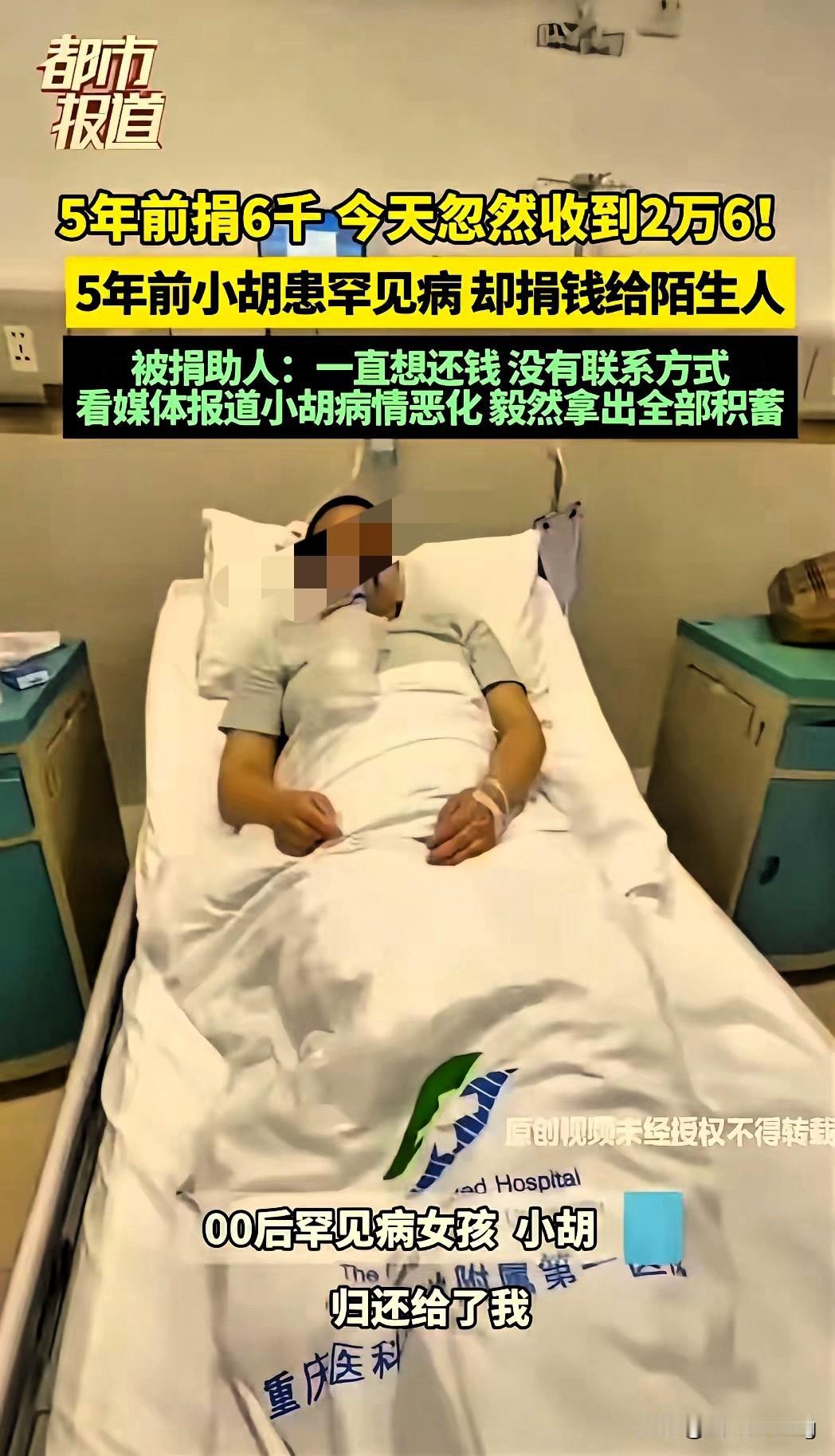 知恩图报,这五个字在重庆小胡的故事里,暖到了骨子里!这哪里是简单的金钱回馈,分明是善良最动人的双向奔赴,是藏在人间里最珍贵的温柔。18岁的小胡揣着8000工资,自己身体不适还拿出6000帮客户渡难关,这份不图回报的善,是刻在骨子里的温柔。她早把这事淡忘,可这份善意却被对方记了五年,在她病危之际,对方拿出全部积蓄26000元,一句“换我守护你”,把善意的轮回写得淋漓尽致。善良从不是一次性的付出,而是一颗种子,你用心种下,哪怕毫不在意,时光也会替你浇灌,在你最需要的时候,长成遮风挡雨的树。那些随手送出的温暖,从不会石沉大海,总会在某个时刻,以温柔的方式回馈你。这世间最美好的事,莫过于我的善意被珍藏,你的感恩有回响。生活里的你,有没有遇见过这样双向温暖的善意瞬间?