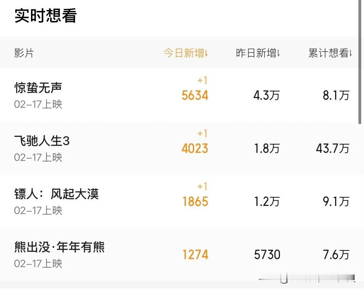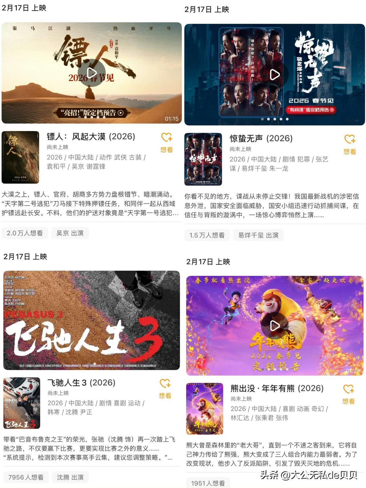 春节档4部的“想看”数据: 猫眼:飞驰人生3 断层领先 灯塔:惊蛰无声>镖人>飞驰人生3>熊出没 豆瓣:镖人>惊蛰无声>飞驰人生3>熊出没 猫眼的应该是最🈶参考价值的,因为本身它就是卖电影票的平台。 豆瓣我觉得参考价值不大,而且追星族居多。 哪部电影在豆瓣黑粉最多,哪部应该就是最不看好的那个。 综合来看,飞驰人生3很有可能会成为26年春节档冠军。 那沈腾可就真的扬眉吐气了!