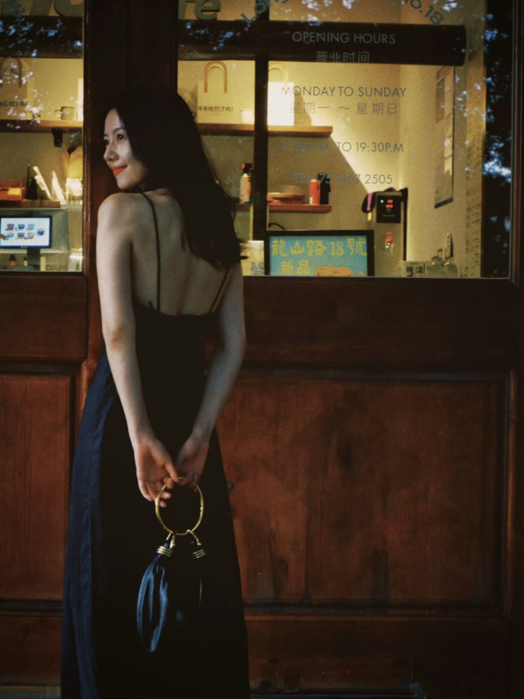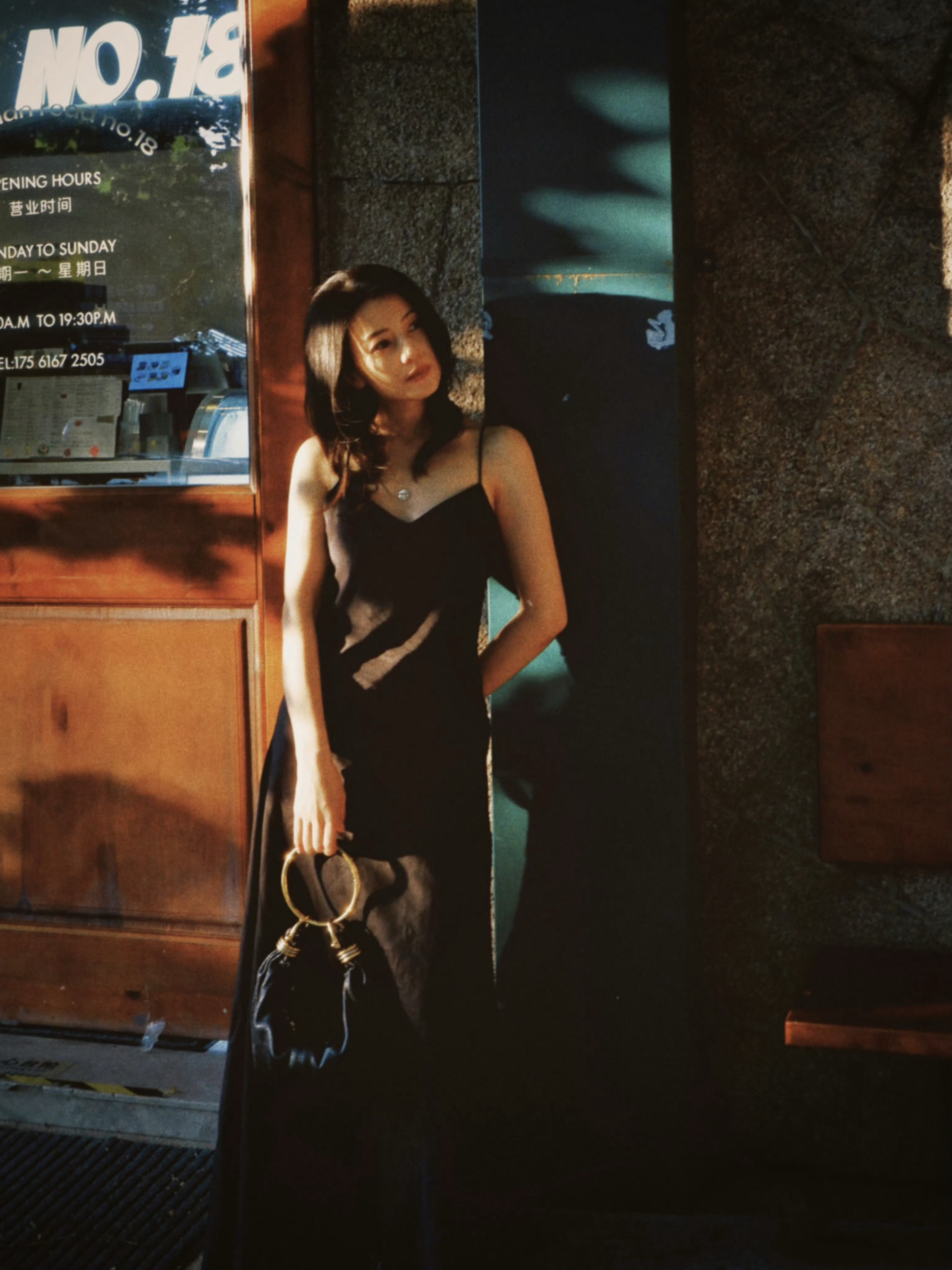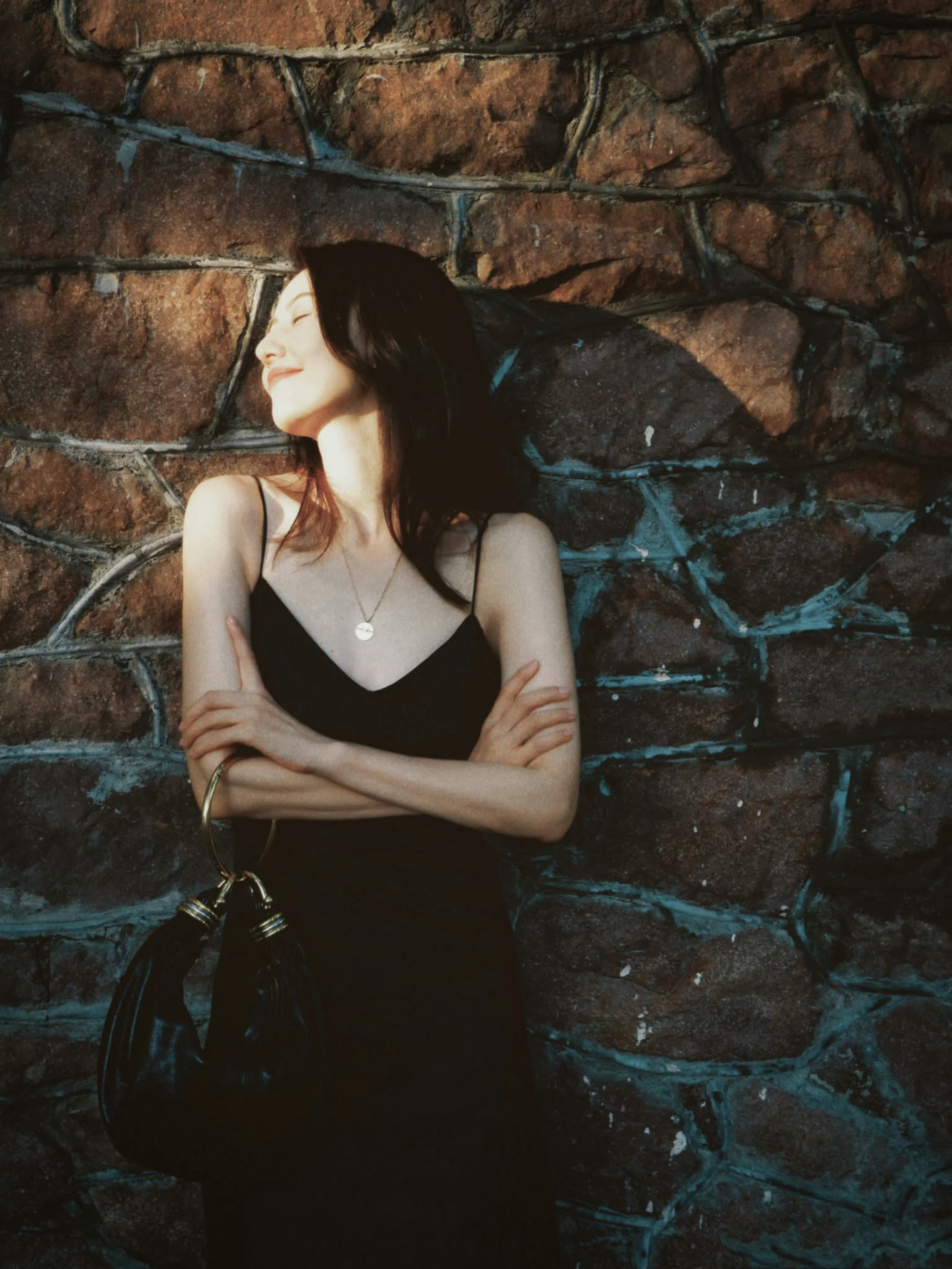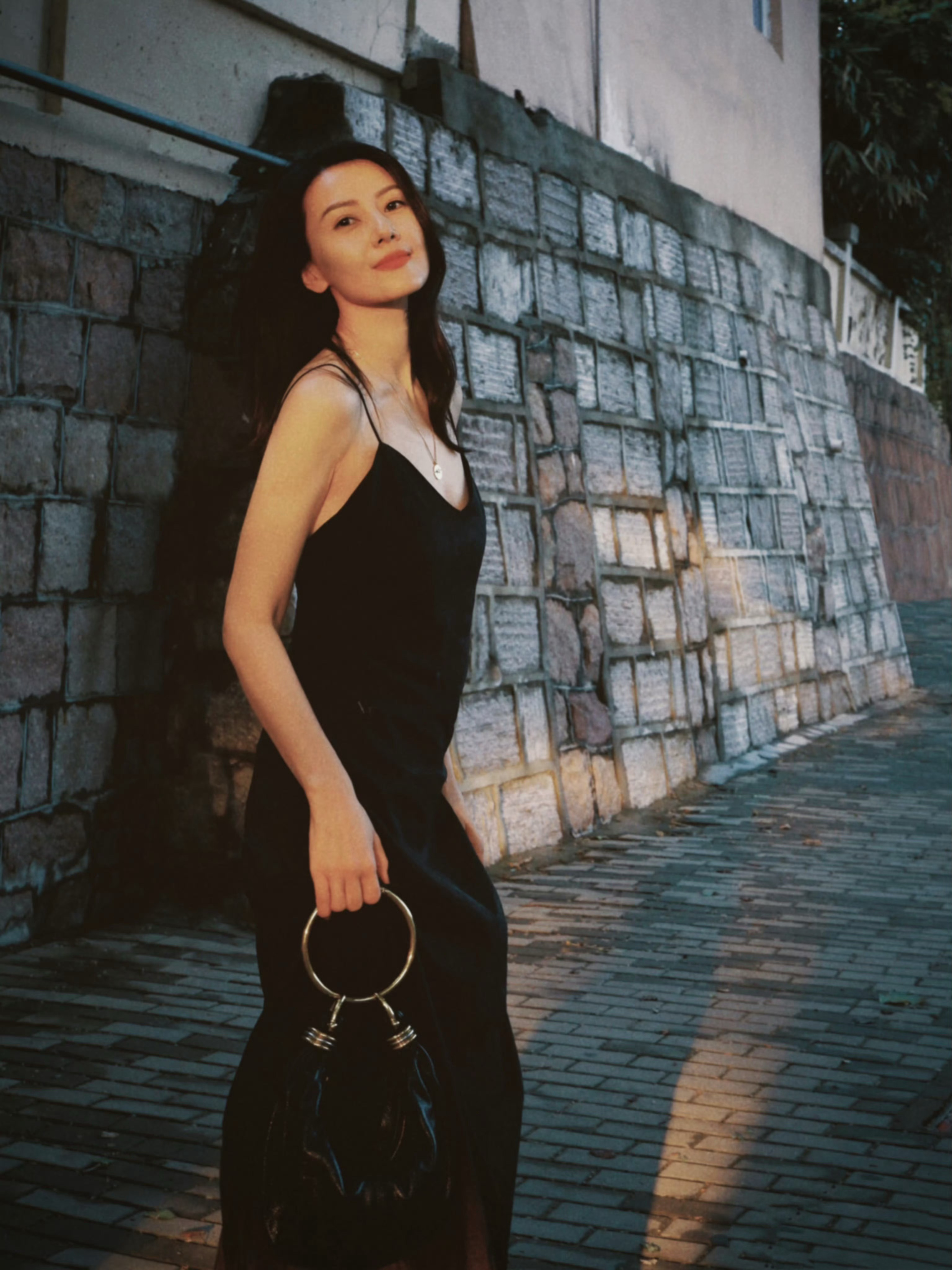OOTD傍晚的阳光被建筑切割成明暗交织的色块,婆娑的树影在墙面上流动,为静谧的场景注入了鲜活的韵律。穿黑色吊带长裙站在明暗交界线处,侧身远眺的神情松弛又带着一丝疏离,轻握着手袋的姿态慵懒而优雅。木质门框的暖棕、石墙的粗粝灰褐,与裙装的沉郁黑形成细腻的色彩层次,让画面在复古质感中透着高级的清冷氛围。没有刻意的表情与姿势,却在光影的包裹下,把都市女性独有的温柔与清醒揉进了每一寸画面里,仿佛一帧可以触摸到情绪的电影截片。高圆圆穿搭高圆圆