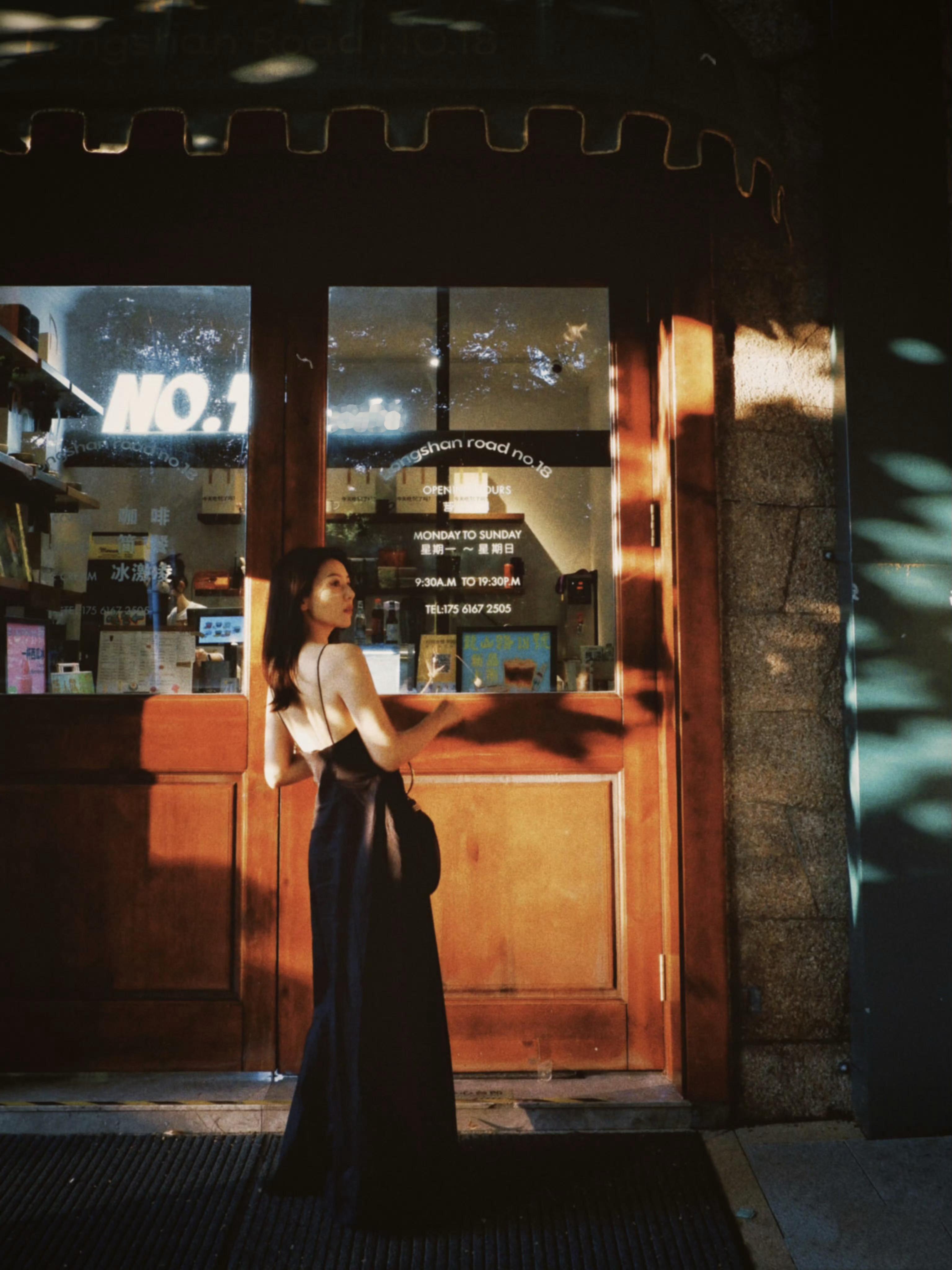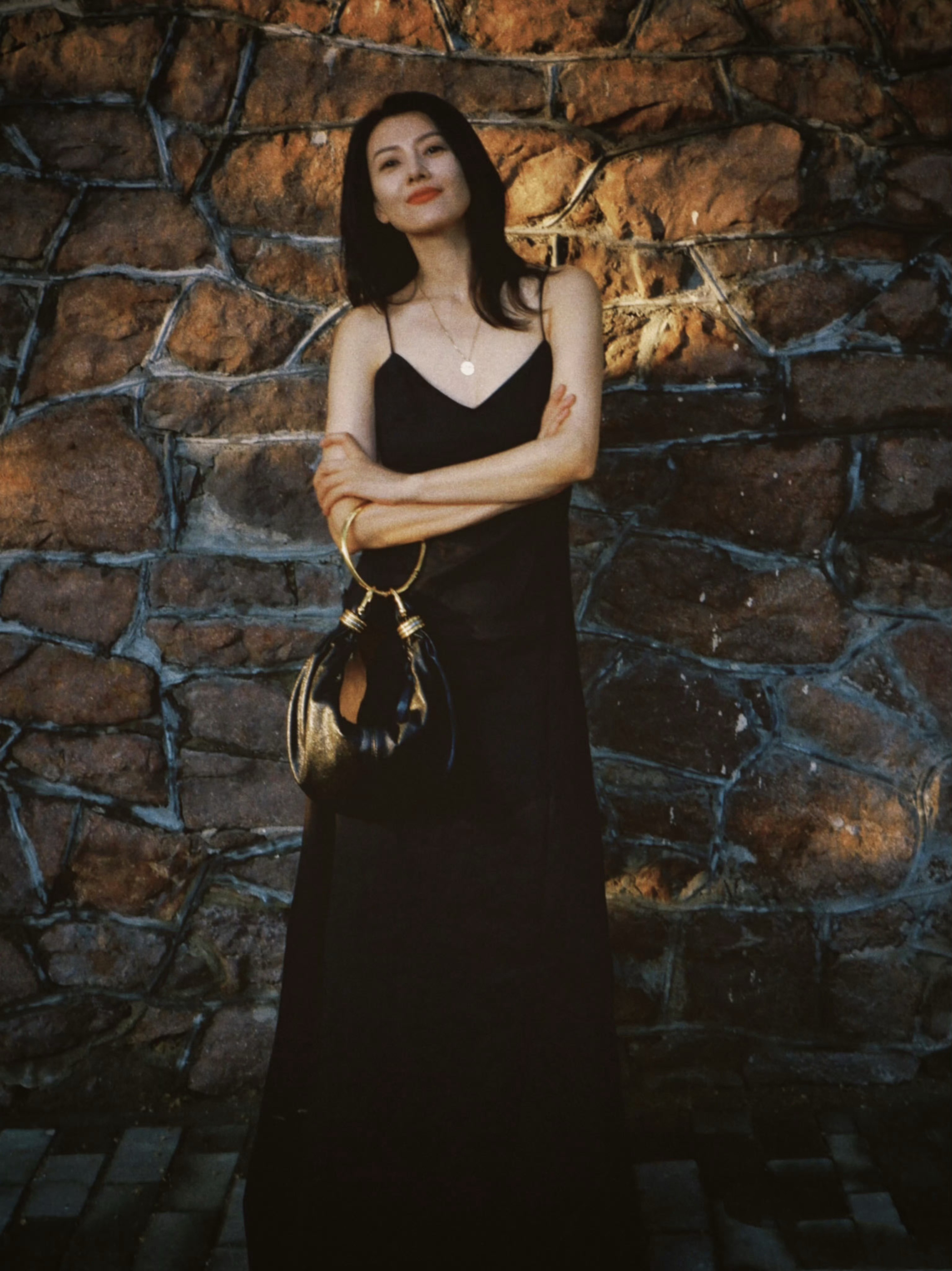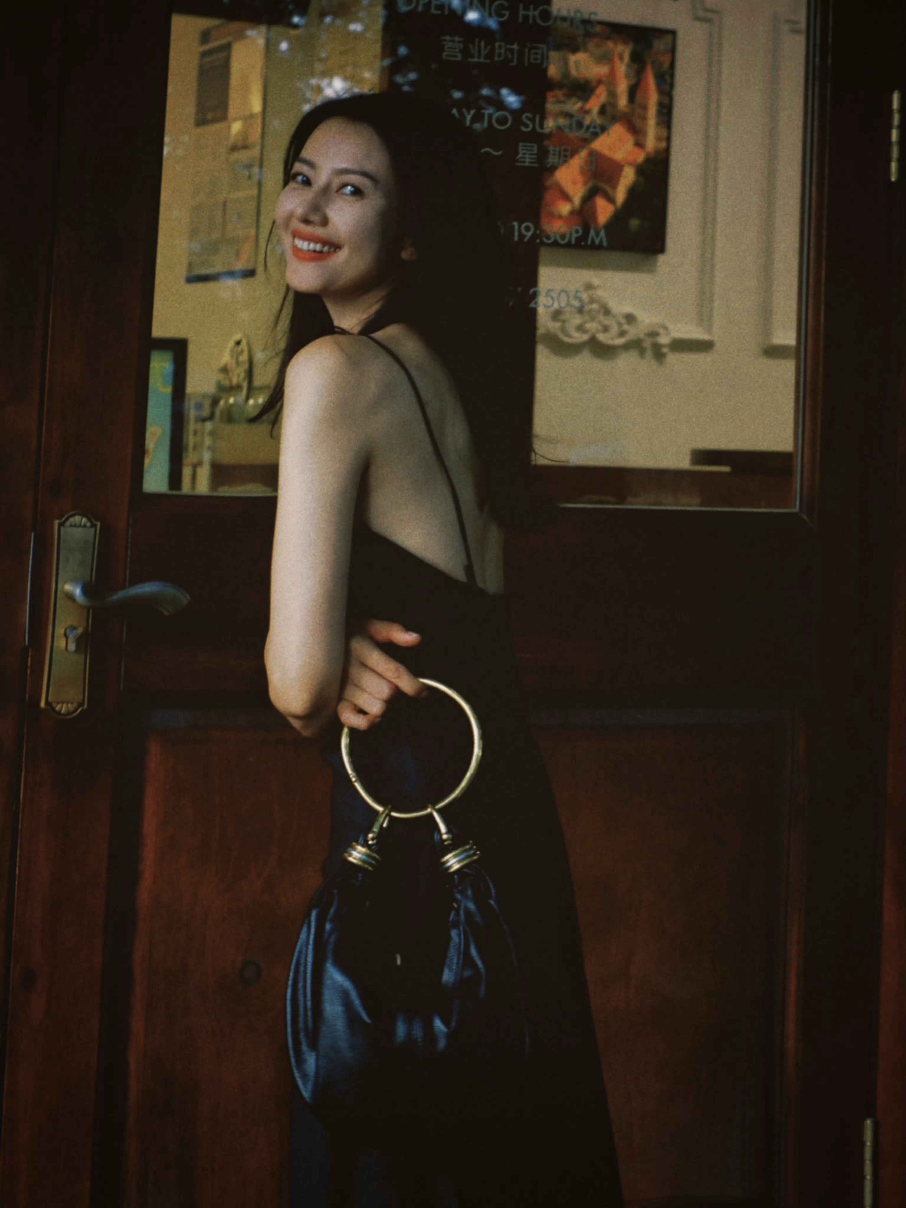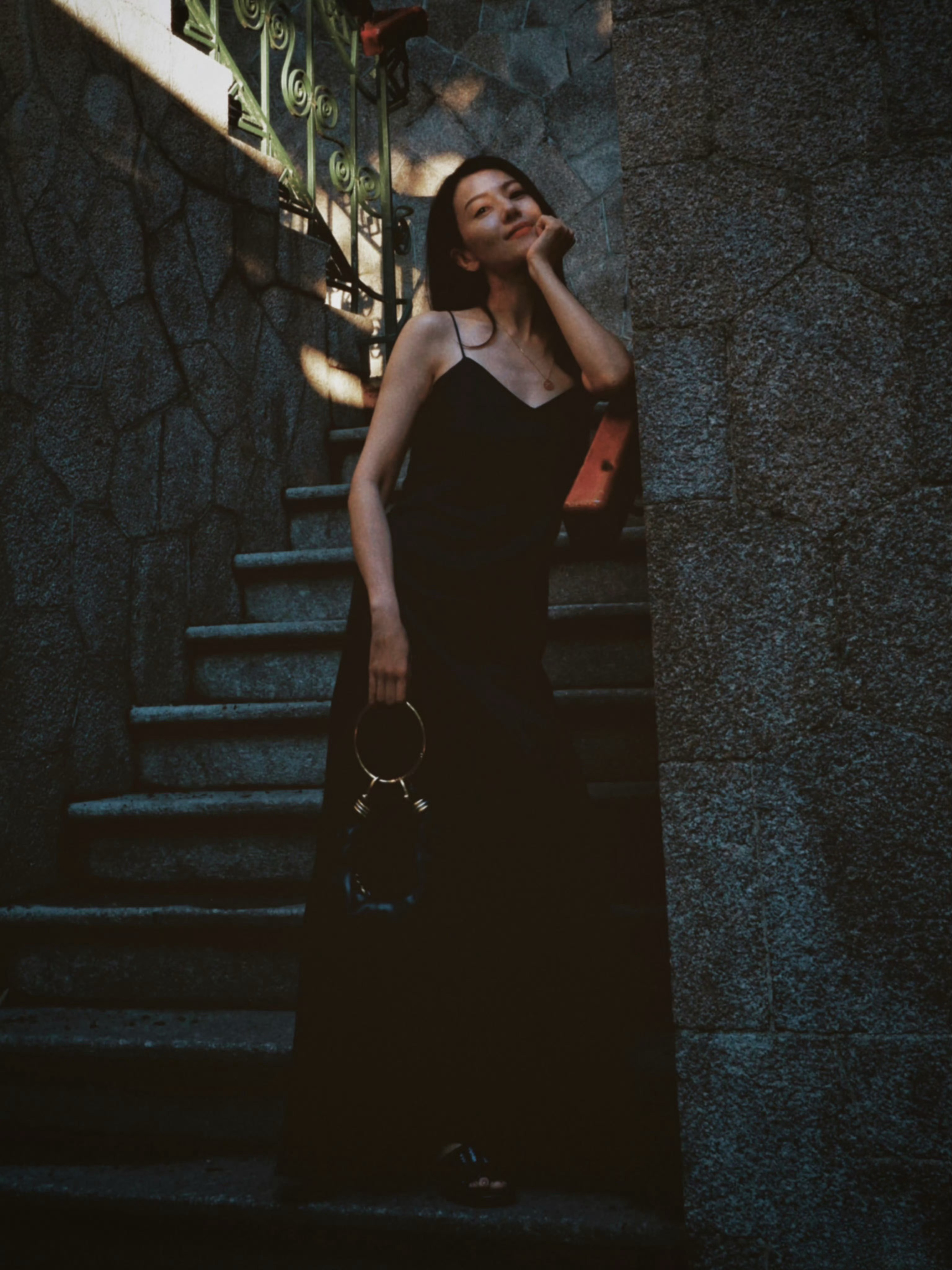 OOTD傍晚的阳光被建筑切割成明暗交织的色块,婆娑的树影在墙面上流动,为静谧的场景注入了鲜活的韵律。穿黑色吊带长裙站在明暗交界线处,侧身远眺的神情松弛又带着一丝疏离,轻握着手袋的姿态慵懒而优雅。木质门框的暖棕、石墙的粗粝灰褐,与裙装的沉郁黑形成细腻的色彩层次,让画面在复古质感中透着高级的清冷氛围。没有刻意的表情与姿势,却在光影的包裹下,把都市女性独有的温柔与清醒揉进了每一寸画面里,仿佛一帧可以触摸到情绪的电影截片。高圆圆穿搭高圆圆