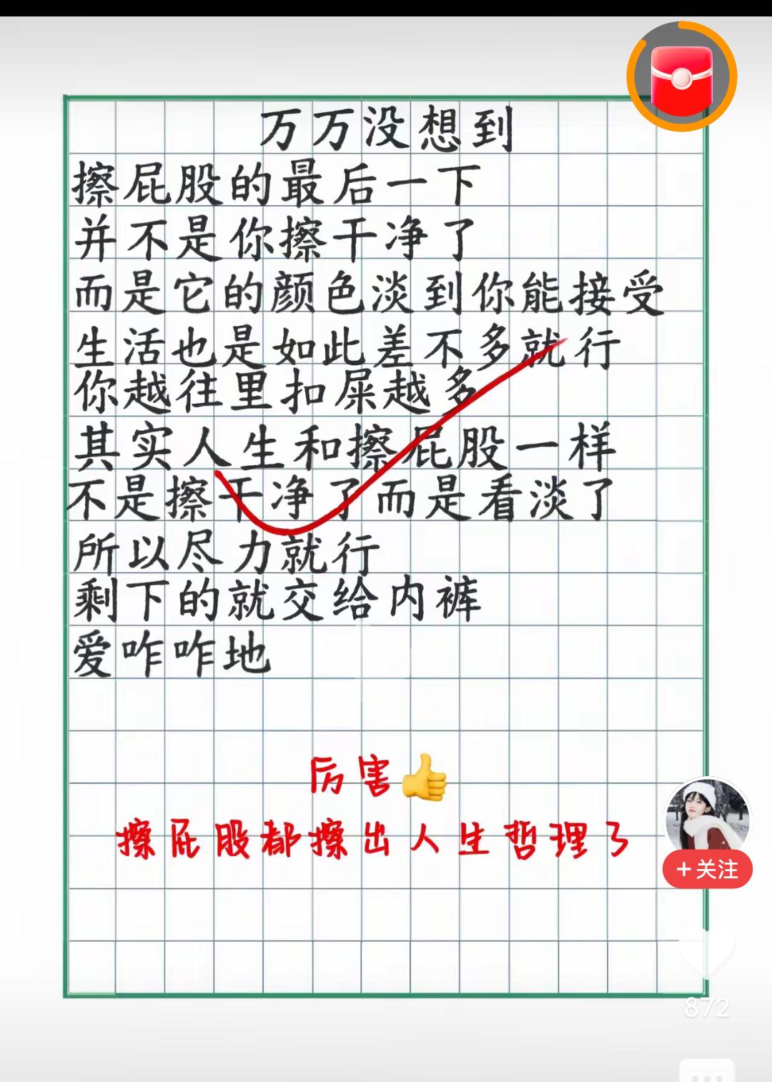 哈哈哈哈哈,简直是绝绝子!绝!妙! 枉我白读了这么些年书,如此简单的人生哲理,竟然在擦屁股纸里! 精彩,精辟,经典!话糙理不糙,头头是条,句句是理!仔细品品吧,还真是这么个理,人人如此,事事如此! 这才是真正的灵魂深处爆发出的生活的哲理和人生,顶级的思维,通透的人生感悟,其他什么这个道,那个教,这个主义,那个语录的,通通相形见绌。 深奥的人生哲理,被如此简单、明了、形象、易懂的诠释出来,佩服!