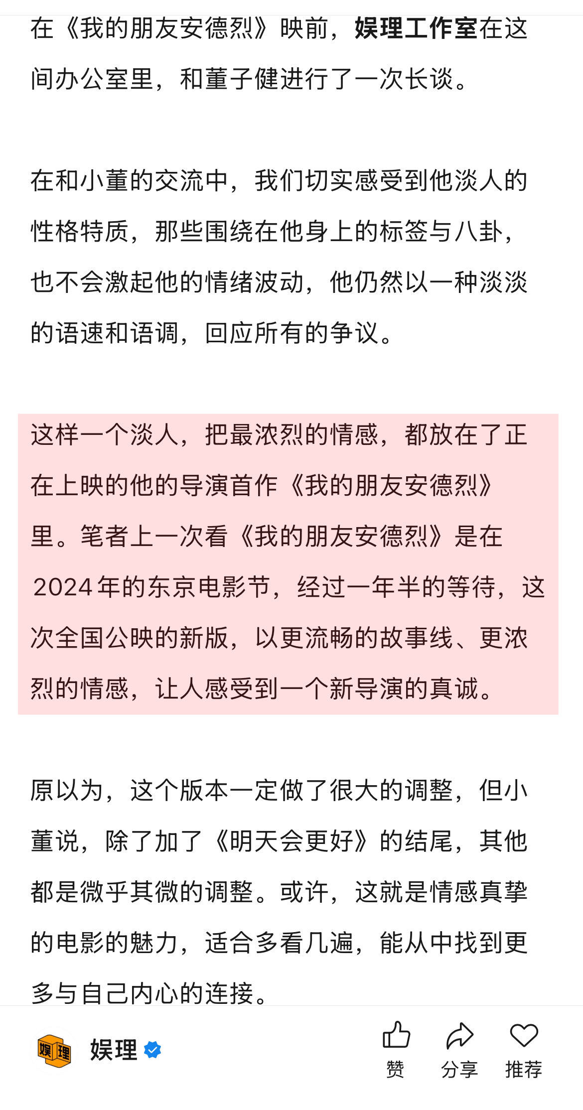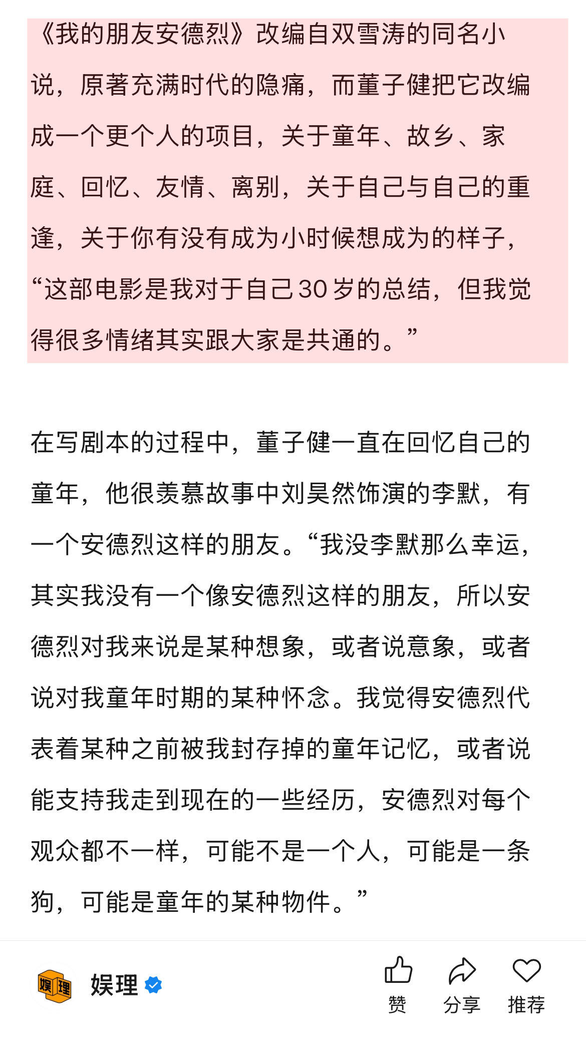 董子健说上网搜自己更多是紧张安德烈是董子健对自己的30岁总结《我的朋友安德烈》改编自双雪涛的同名小说,原著充满时代的隐痛,而董子健把它改编成一个更个人的作品,关于童年、故乡、家庭、回忆、友情、离别,关于自己与自己的重逢,关于你有没有成为小时候想成为的样子,“这部电影是我对于自己30岁的总结,但我觉得很多情绪其实跟大家是共通的。”