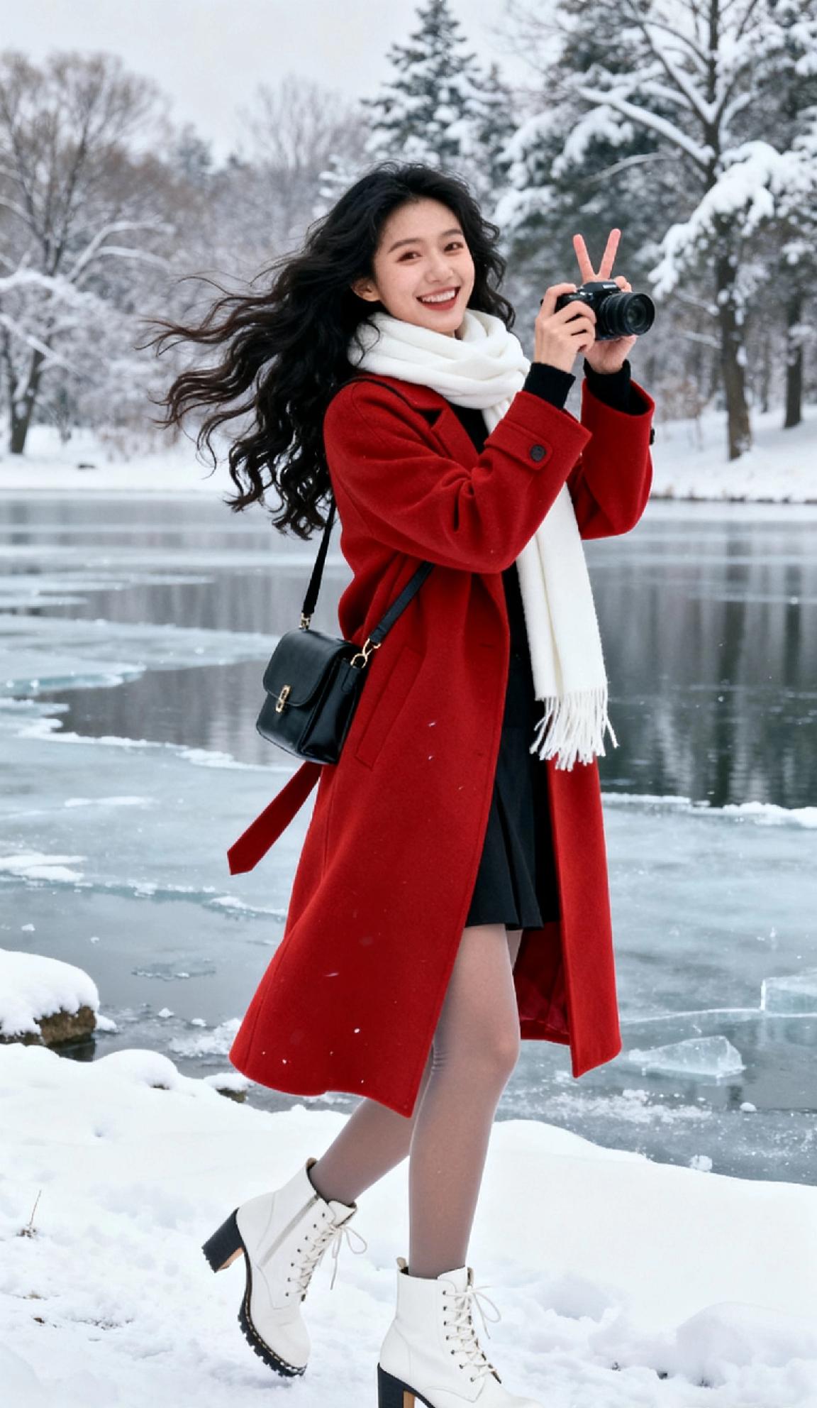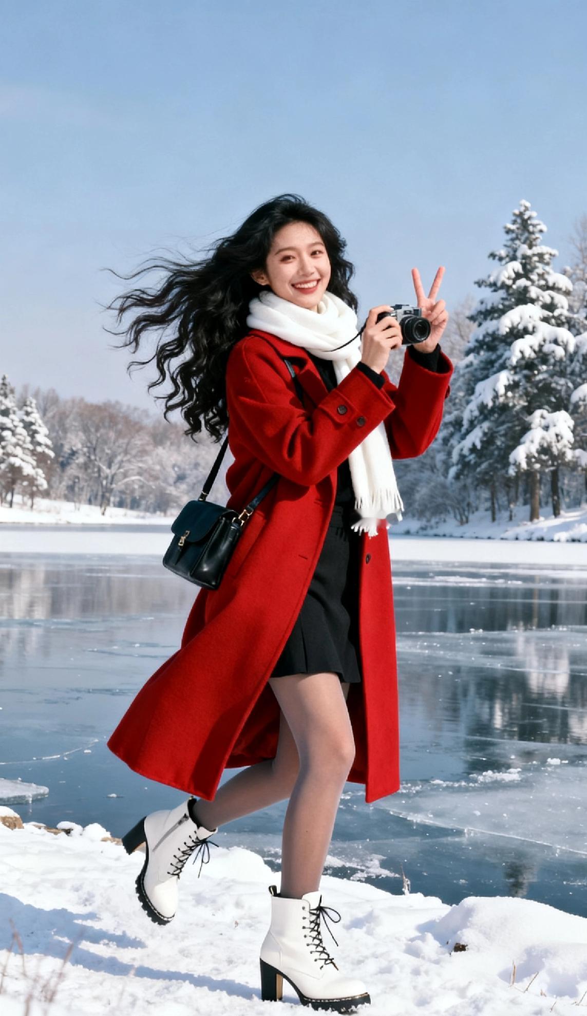 冬日雪景中的甜美女孩,红衣白靴,相机相伴,笑靥如花。
