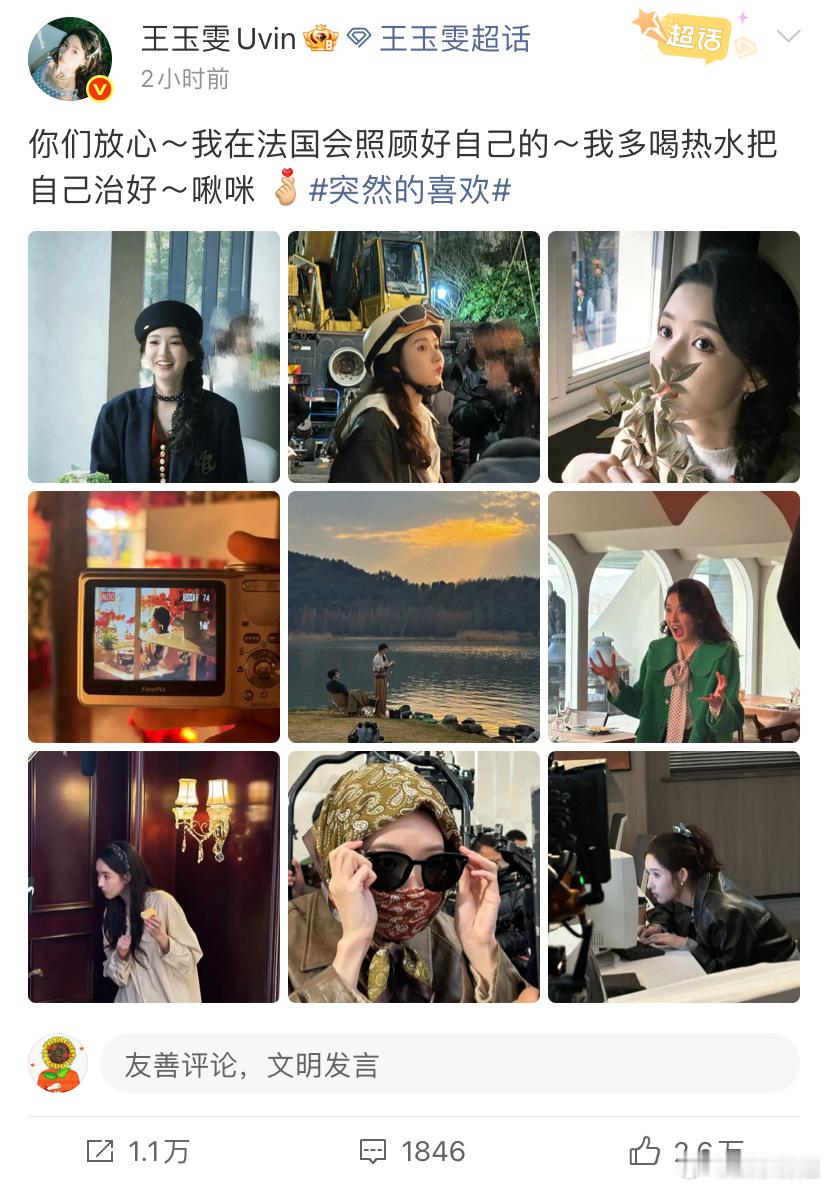王玉雯在法国会照顾好自己的王玉雯报备🈶 你们放心,王玉雯会多喝热水把自己治好~啾咪 今晚继续去看突然的喜欢2025微博之夜爆款创作大赛
