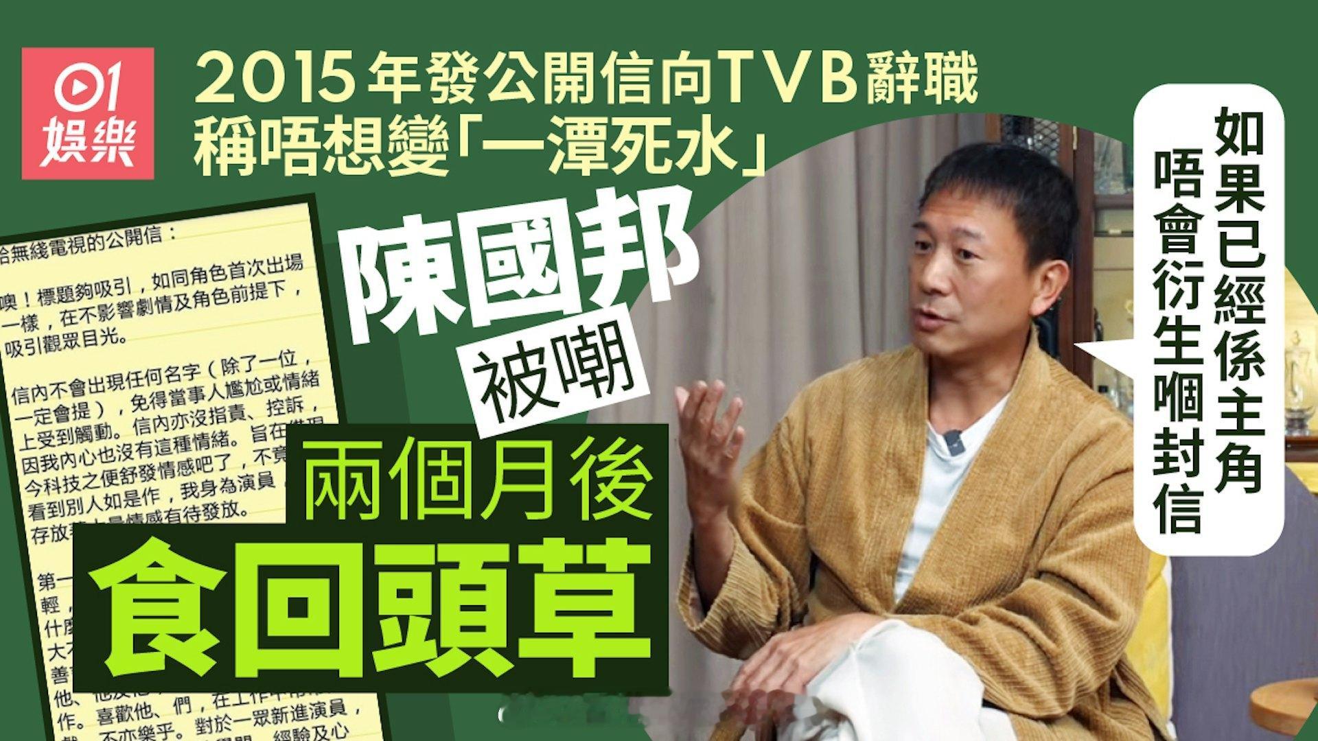 陈国邦曾抱怨TVB发公开信辞职:如果已经是主角不会衍生那封信57岁的陈国邦在电影版《寻秦记》饰演李斯,演技出众无庸置疑。日前陈国邦接受陈志云的YouTube频道访问,重提2015年发布“给TVB的公开信”辞职,指“我不想自己慢慢变作一潭死水,变黑发臭我要流动,我要充满生命...”。当年陈国邦离巢后,却在短短两个月后闪电回归TVB拍摄处境剧《爱·回家之八时入席》,引发外界质疑他“食回头草”博加人工。阿邦今次大方亲述内情,直言当时已被老师钟景辉(King)痛骂,直说:“如果已经是主角不会衍生那封信。”被钟景辉骂冲动:回想是有这些成份在陈国邦透露当时正身在外国演出舞台剧《双十星期二》,因为每日只做一场,有大量时间思考人生方向。他亲述写信经过:“封信我写了不下十封八封,改些用词,同做戏一样有些讯息表达得不清楚,改改改。” 他透露回港落机翌日,已有TVB高层即约他在私隐地方见面。“对方话好欣赏我做戏同行为上面,虽然是比较年青同冲动行为。”陈国邦指信中刻意不提人名,就是不想任何人有压力,但仍被老师钟景辉先生闹,他说:“话我这么冲动做乜,得罪好多人,回想是有这些成份在。”毛舜筠“钦点”回巢拍剧惹负评之所以能迅速回巢,阿邦坦言全靠毛舜筠(毛姐)“钦点”。当时珍姐(曾励珍)找毛姐回归演处境剧《爱·回家之八时入席》,毛姐主动提出要找阿邦合作。阿邦形容与毛姐相识三十载,对方一直很提拔他:“我最初拍电视剧,她看 play back 同监制讲,这个靓仔边个来几好。”面对当年“食回头草”的冷言冷语,阿邦心态平静:“观众觉得你出完封信下月又返来拍嘢,梗是加你人工啦,当时受这些评论,但不怪不知原因嘅人。”前辈催收工有感而发谈到发信的终极导火线,阿邦承认际遇是主因:“如果我已经有在TVB做主角机会嘅话,一定不会衍生那封信,正因为自己际遇不好,但又觉得自己不错,点解有这样的际遇?!”另一原因是他目睹一位欣赏的前辈在片场催促大家收工,令他极大打击:“这件事给我敲钟声,我将来会否变成这样?我现好钟意做戏。正如信中我不知道自己会去边度,但我惊失去表演热诚。”含泪问苍天: 为什么世界会是这样?!另外,访问中阿邦透露有四个兄弟姊妹,自己排第三,由于家境较困难,曾被严父“打到跌在条街度”。他坦言自爆中五未毕业已离家生活。当年为了赚取演艺学院学费,阿邦的生活极其艰苦:“凌晨四点起床整蛋挞卖面包,中午在校洗碗,放学后到艺术中心做带位,周六日再到超市落货。”他忆述曾平均一周有两日是“24小时没得睡”。不过,拍戏后感受过生死顿悟人生,在父亲晚年父子关系修好。而提及信仰的问题,情感丰富的陈国邦谈了一些哲学问题,最后更在镜头前激动洒泪问苍天:“为什么世界会是这样?!”他坦言难以解释自己正在寻找什么,并为激动情绪说声“对不起”。