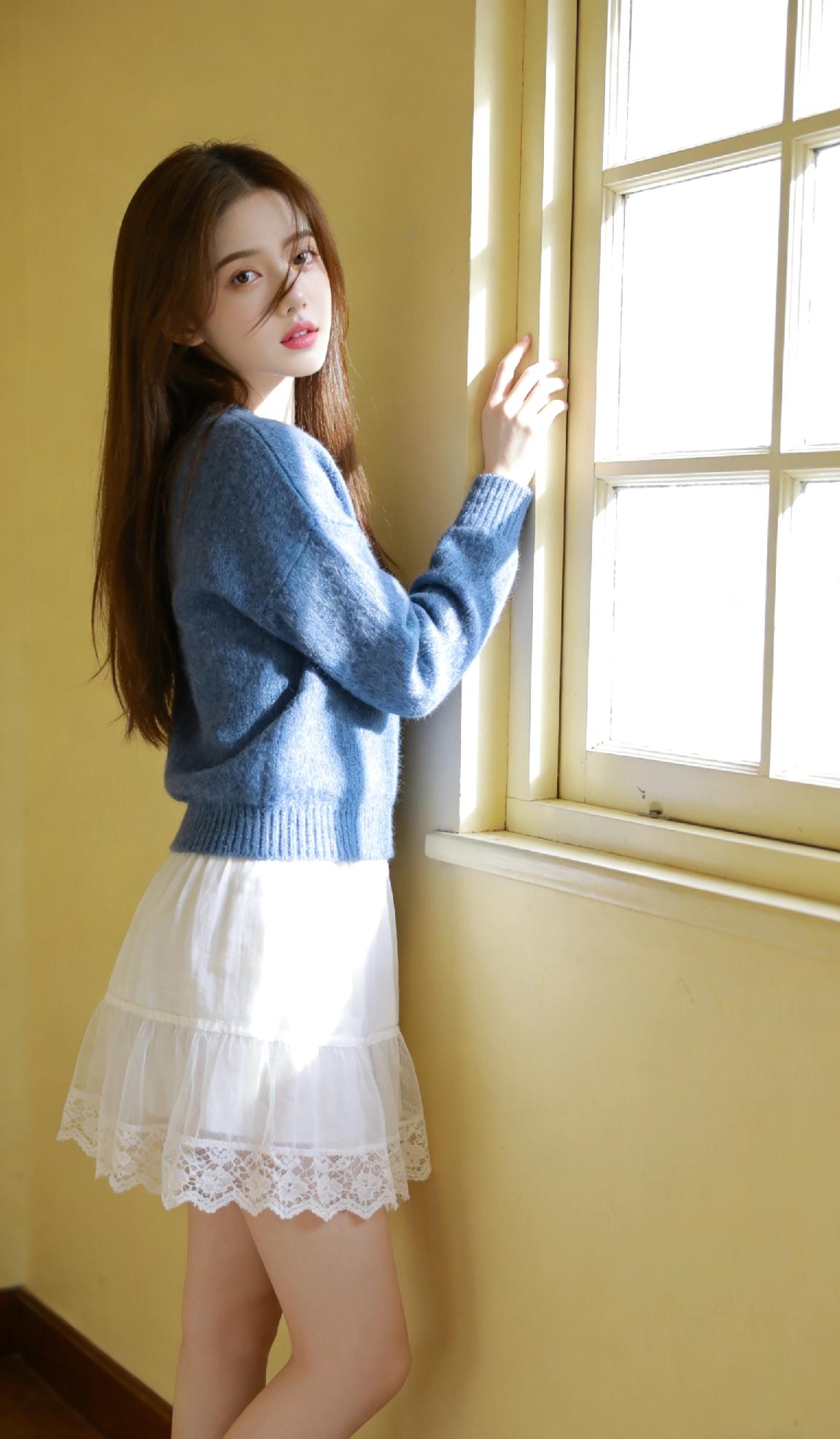 优雅白衣少女,镜中倒影,尽显温柔与自信。