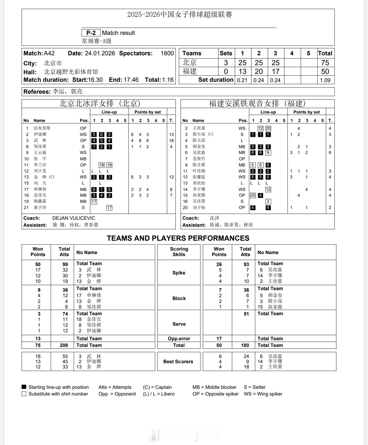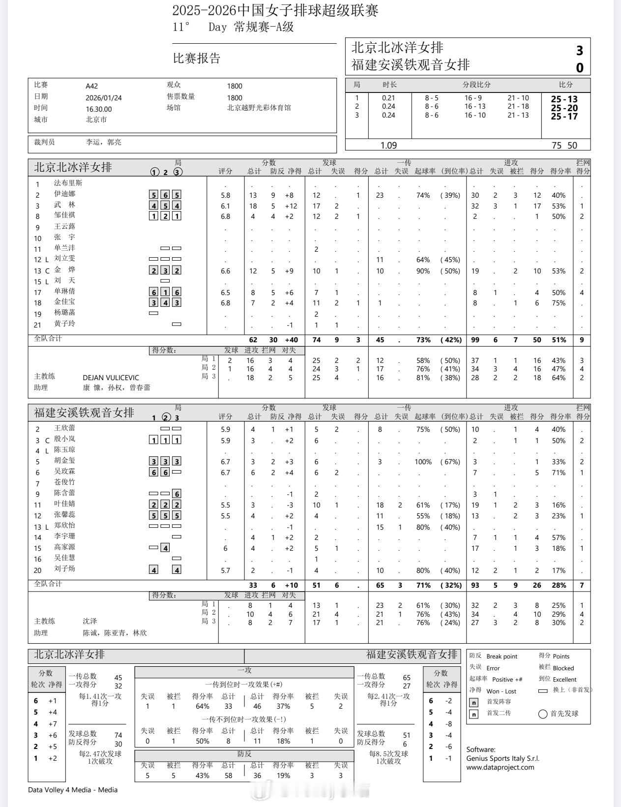 【技术统计】排超联赛第11轮,北京女排3比0福建女排(25-13 25-20 25-17)排超联赛2025-2026中国排球超级联赛