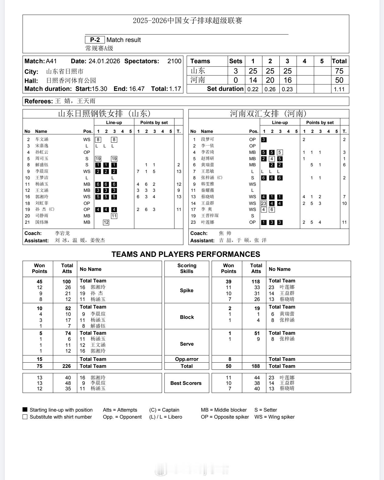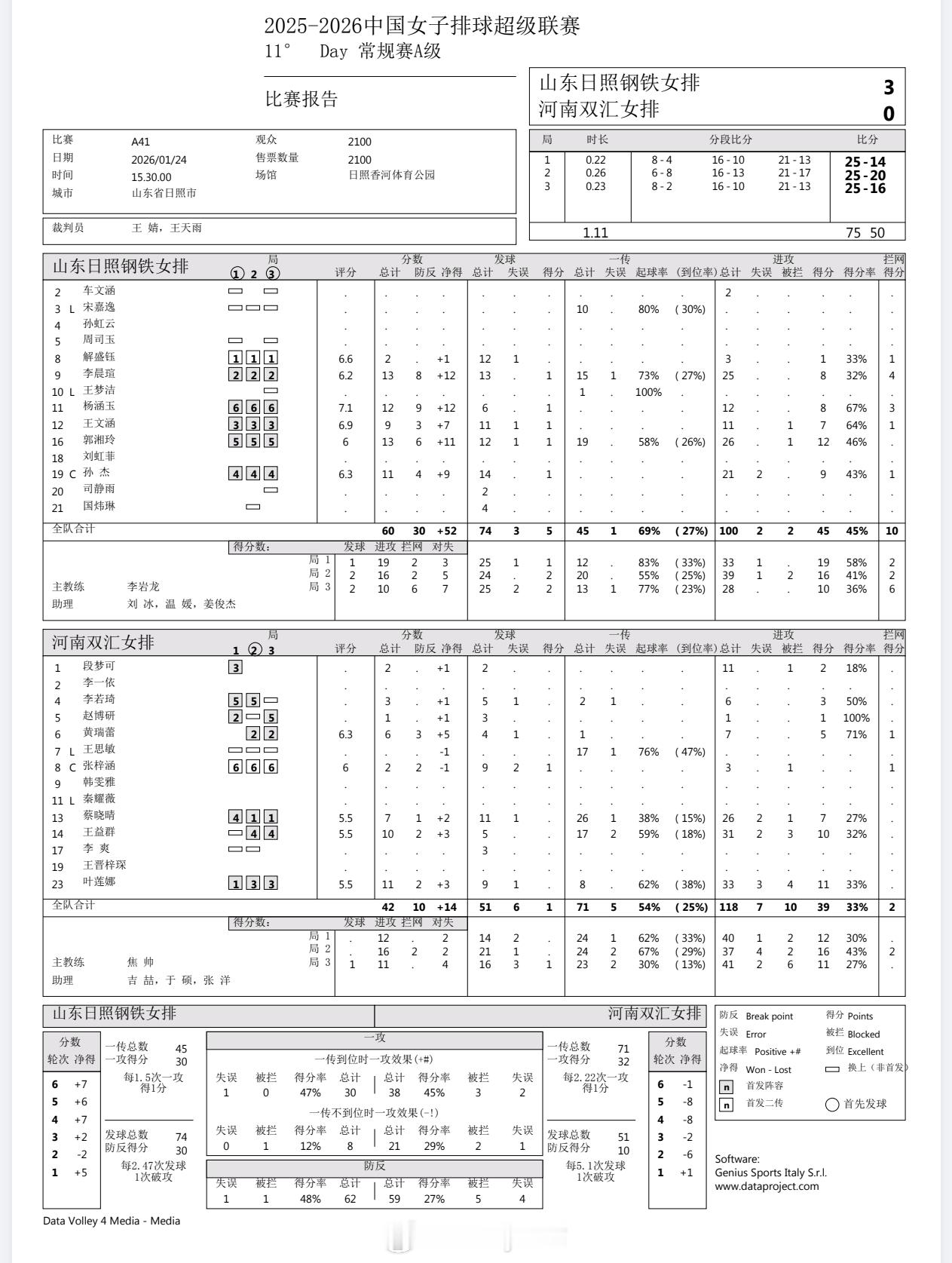 【技术统计】排超联赛第11轮,山东女排3比0河南女排(25-14 25-20 25-16)排超联赛2025-2026中国排球超级联赛