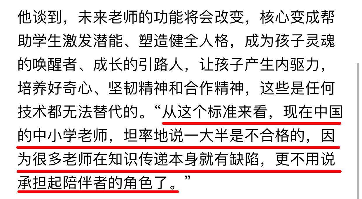 作为国内商业教培界的祖师爷级人物,俞敏洪认为中小学老师“一大半不合格”不仅背离事实,也证明他根本不了解一线老师的艰难处境。老师要当灵魂唤醒者、领路人,前提是老师有足够的时间和精力,家长要成绩学校也要成绩,打还不能打(体罚不被允许)、骂不敢骂(一骂就抑郁),精力都在管熊孩子和提高成绩上,这在俞老师看来反倒成了一个个不合格的“陪伴者”,空话好讲好老师真的难当。
